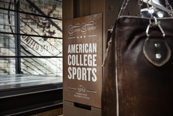 Level 0 is characterised by three different worlds which emphasise the new ranges from Tom Tailor: the American College Sports area reflects a classic sporting dream. Furniture and sports equipment featuring wood and leather details are arranged on the oak parquet flooring in a vintage style, recreating the character of an old American gym. In the middle of the space is an art courtyard which presents the Authentic Urban Wear range. This forms the core of the stand and exudes the urban flavour of New York’s streets. Here an oak platform and white fixtures catch the eye.