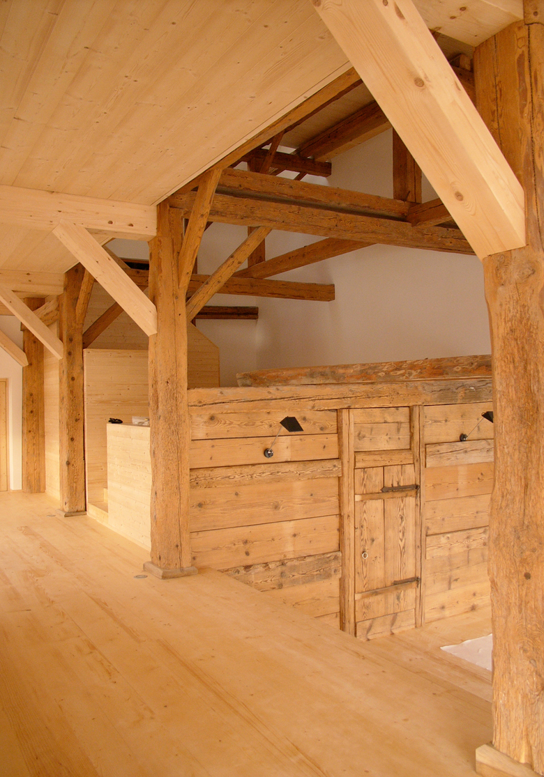 Scheunen sind Räume mit interessanten Raumformen, einer Baustruktur mit kräftigen Holzdimensionen und einer nachvollziehbaren Fügetechnik. Diese Qualitäten können zu aussergewöhnlichen Raumkonstellationen und einer starken Erlebnislandschaft genutzt werden.