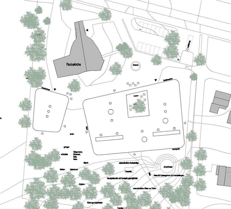 Das Kinder– und Familienzentrum ist für ca. 150 Kinder als eigenständiger Solitär unter einem Dach konzipiert. Gegenüber der denkmalgeschützten Kirche hält sich das Gebäude durch seine „Eingeschossigkeit“ zurück und öffnet sich mit einem Eingangshof zur Nachbarschaft. Als trapezförmiger Grundkörper mit ausgerundeten Ecken lehnt sich das neue Gebäude an die organische Formsprache der bestehenden Kirche an und fügt sich in den landschaftlichen Grundcharakter des Grundstücks.