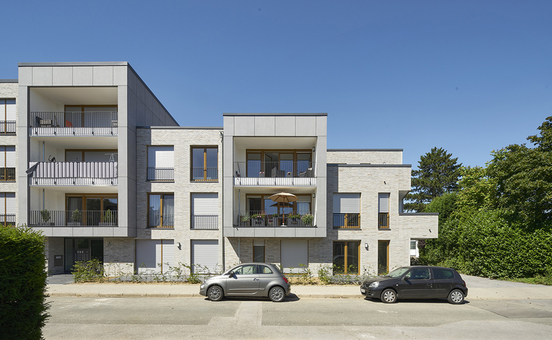 Das helle Klinkermauerwerk verlässt dabei spielerisch die Geometrie des rechten Winkels und nimmt den Verlauf des unregelmäßig geschnittenen Grundstücks auf. In diese Figur sind drei strenge Quader eingelassen, die die Loggien der Wohnungen aufnehmen und die Fassade rhythmisieren. Diese Quader sind mit großformatigen Faserzementplatten bekleidet und kontrastieren mit dem lebhaften Klinker.