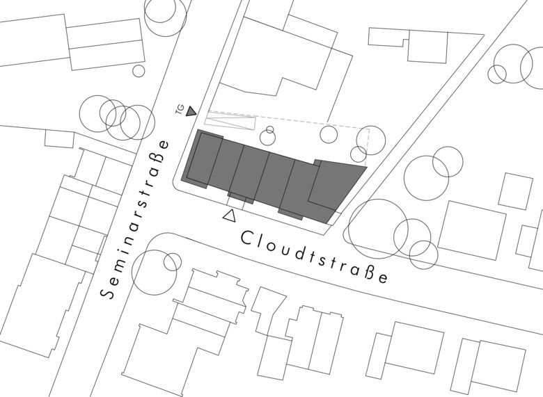An der Seminarstraße markiert der Entwurf selbstbewusst die Straßenkante mit sehr großzügigen Loggien. Nach Osten treppt sich das Gebäude auf eine Höhe herunter, die den Übergang zur Wohnbebauung herstellt.