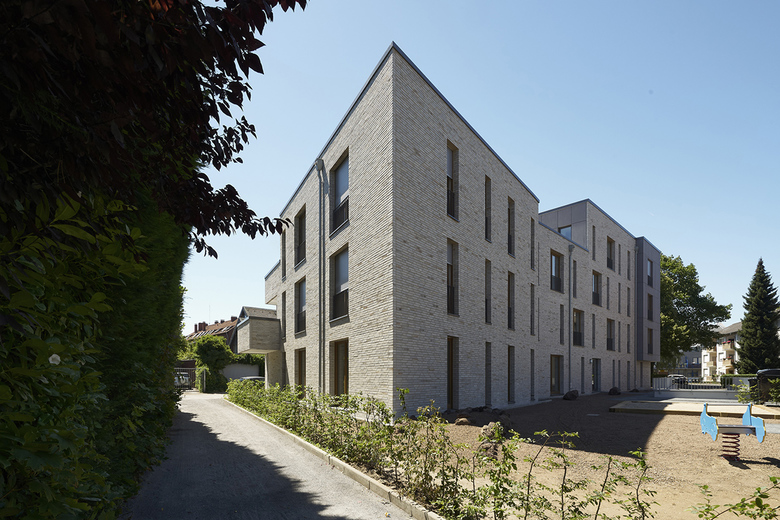 Der Neubau für den Bauverein Moers auf dem Grundstück eines Innenstadt-nahen Gebietes markiert eine Schnittstelle zwischen einer kleinteiligen Einfamilienhausbebauung und einer Straße, die mit Mehrfamilienhäusern durchgängig höher bebaut ist.