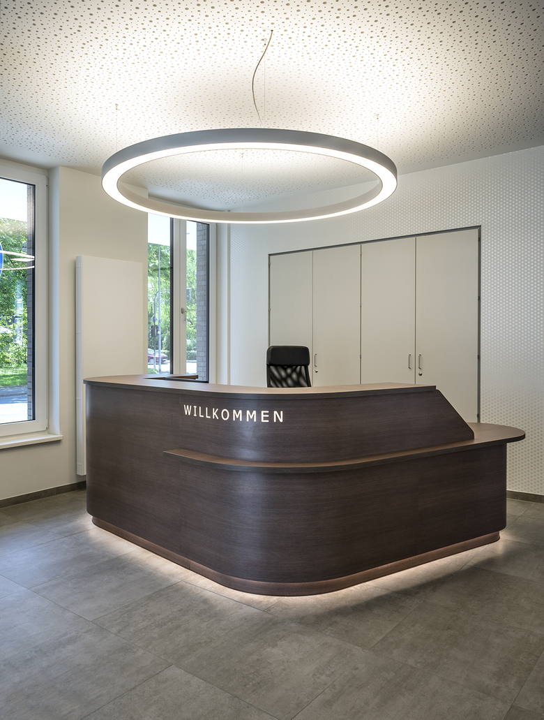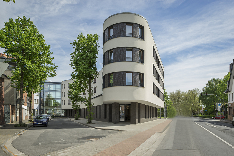 Über den kleinen Platzraum des Friederike-Fliedner Platzes, der städtebaulich durch eine Baumreihe zur Ringstraße gefasst ist, gelangen die Besucher zum neuen Eingang des Seniorenzentrums. Die Markthalle im Erdgeschoss als zentraler Kommunikationsort für Bewohner, Angehörige und Anwohner ist im Bereich der Straßenkreuzung Friedrich-Heinrich-Allee und Ringstraße angeordnet, so dass die Nutzer am städtischen Leben teilnehmen und die Aktivitäten in Straßenraum mit verfolgen können. Durch eine transparente Brücke - ausgebildet in Form einer gläsernen Fuge - werden der Neubau und der Gebäudebestand miteinander verbunden.
