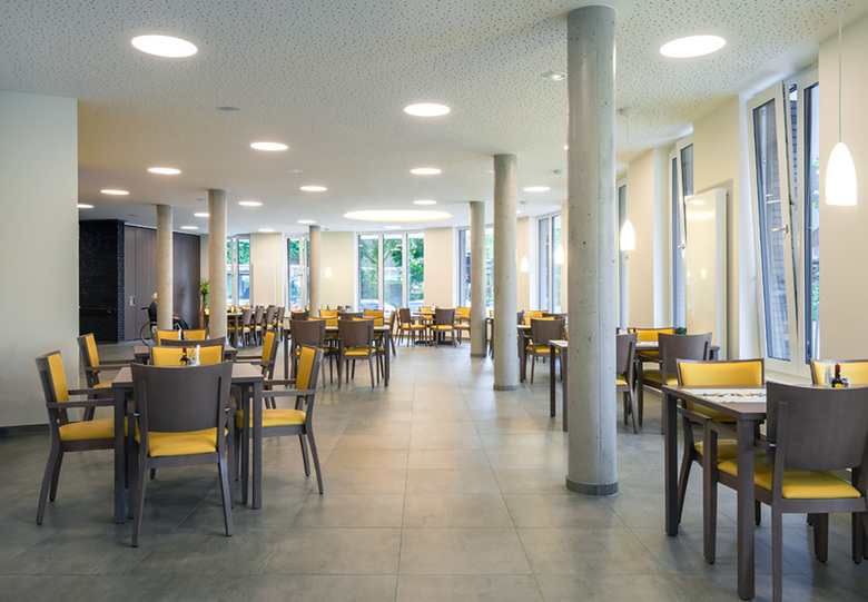 Den Mittelpunkt - auch räumlich - des kommunikativen Lebens der Bewohner bildet der Wohn-Gemeinschaftsraum. Ihm gegenüber liegt der zusätzliche Aufenthaltsbereich, der zum Verweilen einlädt. Alle Bewohnerzimmer haben eine südliche bzw. eine westliche Ausrichtung. Somit können die dort lebenden Menschen das Geschehen in den beiden Straßenräumen von Ringstraße und Friedrich-Heinrich-Allee mitverfolgen.