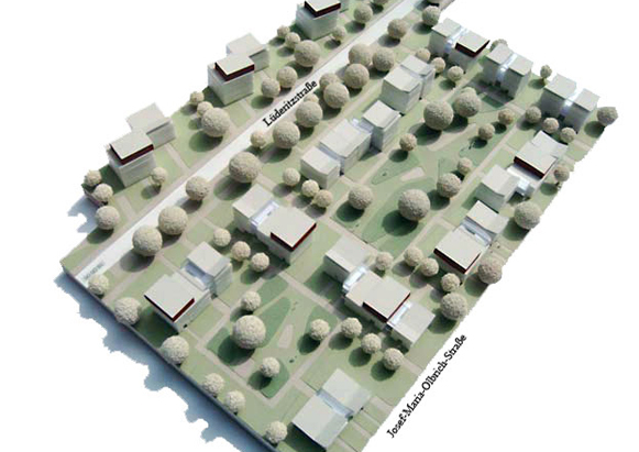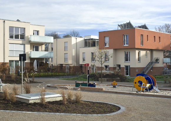 Die Wohnbebauung hat vom Land Nordrhein-Westfalen den Status der Solarsiedlung erhalten. Die einzelnen Bauteile der Außenhülle wurden entsprechend dem Wärme- und Energiekonzept geplant, so dass der Heizenergiebedarf 35 kWh/m²a nicht überschreitet. Eine kontrollierte Wohnungslüftung mit Wärmerückgewinnung, Sonnenkollektoren und Fotovoltaik sind energetische Bausteine der Bebauung. Der 1. Bauabschnitt umfasst 57 Wohnungen in 8 Häusern und 3 Tiefgaragen. Davon werden 21 Wohnungen im Rahmen des sozialen Wohnungsbaus gefördert. Das Bauvolumen wird durch Vor- und Rücksprünge plastisch gestaltet. Die gläsernen Treppenhäuser, als Fuge ausgebildet, fördern die Kleinteiligkeit der Bebauung. Im Erdgeschoss sind alle Wohnungen barrierefrei. Individuelle Eingänge schaffen Privatheit und geben den Bewohnern eine “eigene Adresse“. Die geförderten Gebäude erhalten einen Aufzug; somit sind 60 % der Wohneinheiten barrierefrei und altengerecht. Die aufgesetzten farbigen Wohnboxen geben dem neuen Quartier einen eigenständigen Charakter.