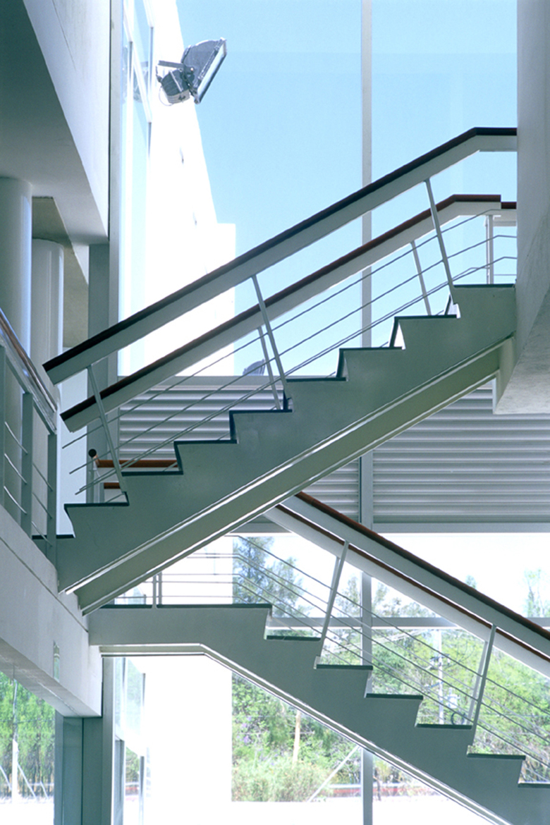 The thread that guides this leisure center finds its main anchors in the pool and the mixed use equipment. The triple height that contains the machines is intertwined with elevated corridors where the cardio equipment is located. Imagined as a central nave: the column sequence, the vertigo of the bridges, the interplay of light, nonetheless, everything is finally resolved in the depth and warmth of the mahogany mural on the east side which extends towards the pool area. From the façade of Naciones Unidas the spectator can guess the importance of thevertical volume that houses the baths; it is the only volume detached from order of orthogonality, a gesture of independence that determines itself andits relation to the other areas of this leisure complex.
