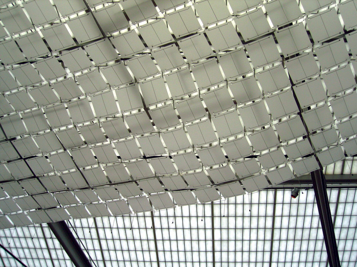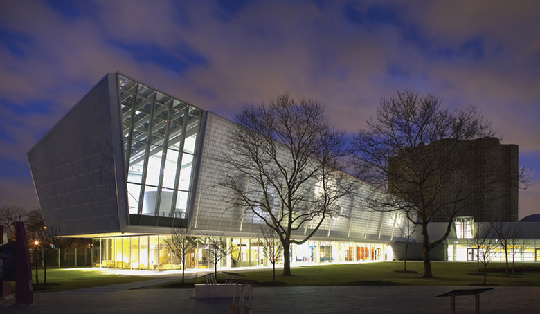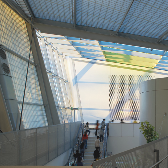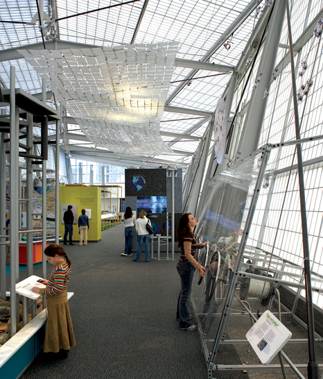 The expansion redefines and augments the exhibit sequence and rationalizes circulation throughout the building. The long, low volume of the new building, defined by luminous folded planes, is a formal counterpoint to the undulating vertical form of the original World’s Fair pavilion, defined by its iconic cellular concrete and dark cobalt cast glass frame. A space of muted white light, the exhibit hall hovers over a transparent base that furthers the museum’s goal of accessibility by allowing passersby glimpses into the interior. The Discovery Labs, adjacent and open to the new exhibition spaces on the upper and lower levels, are given visible identity and ambiguous thresholds to draw in visitors. Also connected to the new hall, an exhibition space for traveling shows provides a light-controlled gallery. A landscaped precinct is home to the renovated Rocket Park and accommodates outdoor programming. Current work includes exterior stabilization of the Great Hall and interior renovations.