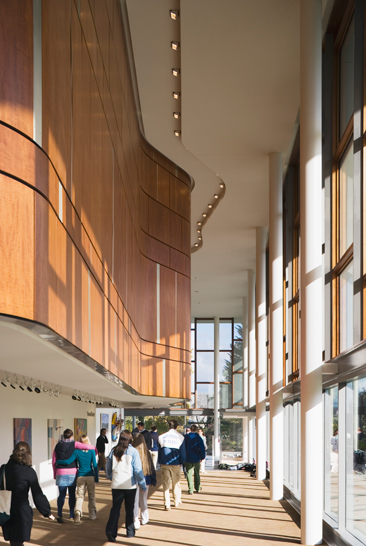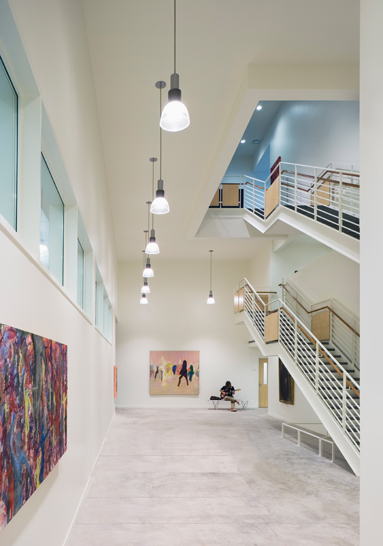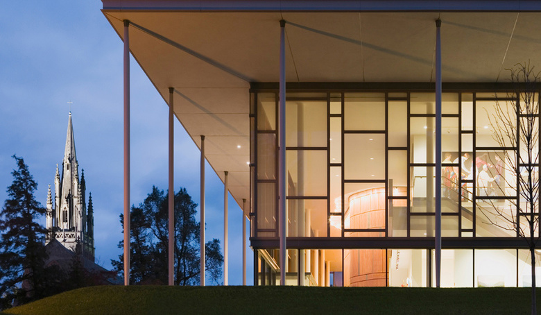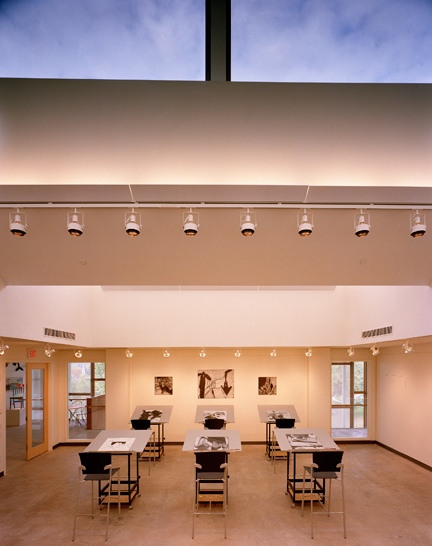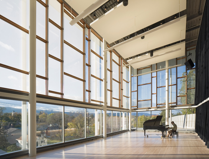 This flexible and sophisticated facility for teaching the performing and visual arts encourages cross-disciplinary exploration. The building mass nestles into its sloped site on the main quadrangle, reinforcing the scale of the campus and diminishing the impact of the theater’s fly tower. Natural materials, including wood and Pennsylvania limestone, reinforce the connection with the sylvan landscape on four sides. The floor-to-ceiling glass curtain wall envelope blurs the distinction between indoor and outdoor spaces. Transparency of the glass and its luminosity at night reinforce access to the arts. Variable acoustics and advanced theater teaching technologies support the Academy’s goal to incorporate the performing arts into its core curriculum, and the theater provides an assembly space to accommodate the entire school.