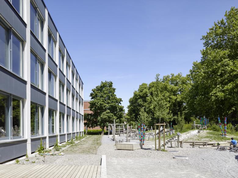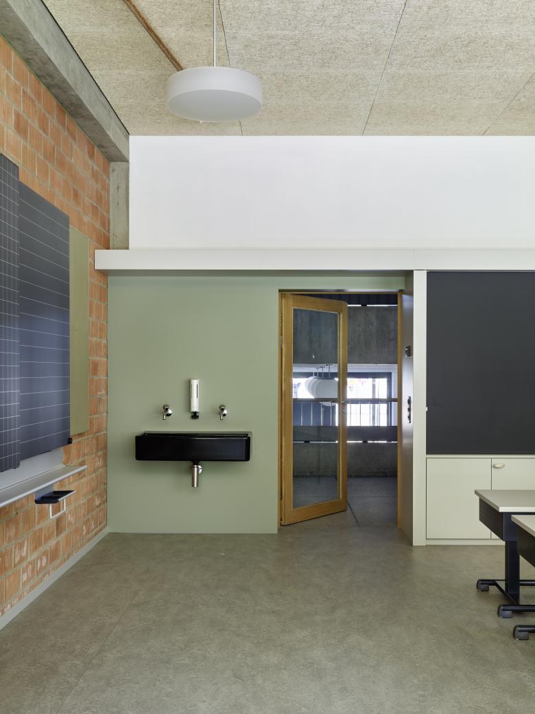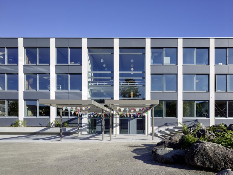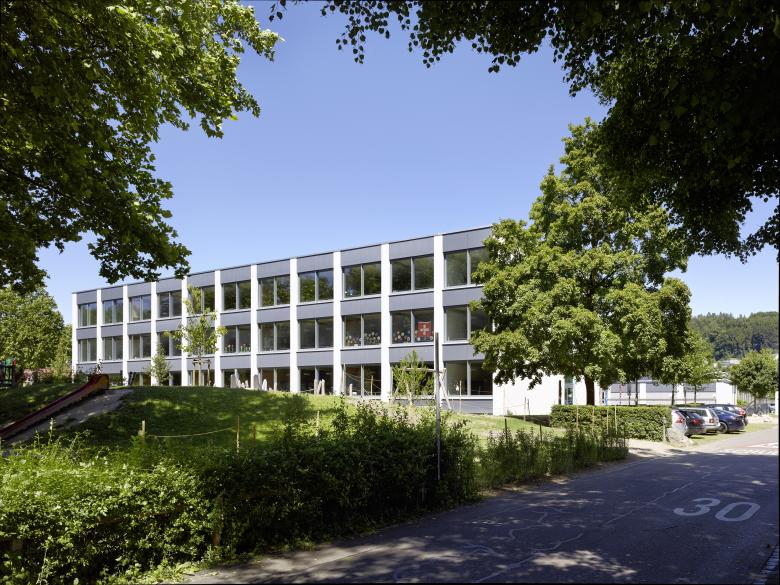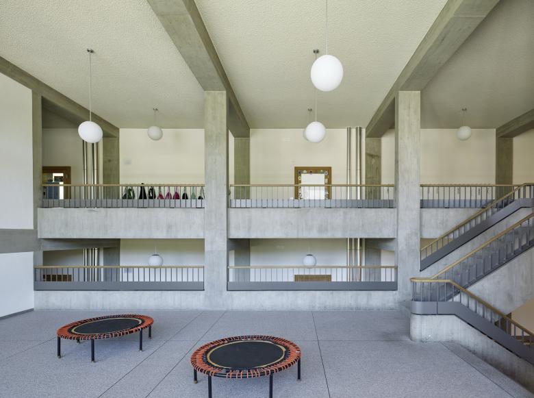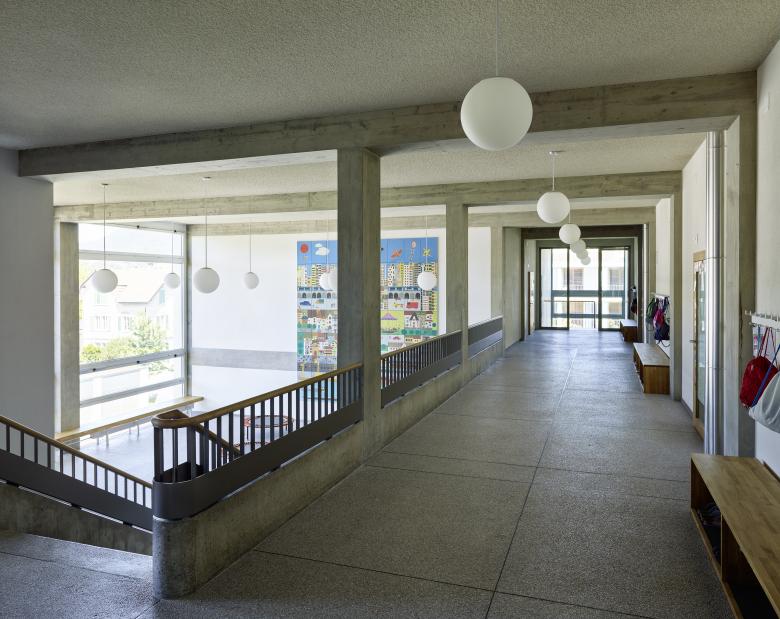 Das bestehende Gebäude wird an die heutigen Anforderungen wie Hindernisfreiheit, Brandschutz und Erdbebensicherheit angepasst. Mit der Einführung zweier neuer Fluchttreppen kann die Haupterschliessung vielfältig genutzt werden und die beiden grosszügigen Zwischenpodeste dürfen möbliert werden. Im Hinblick auf die stark steigende Schülerzahl wird der südliche Aussenbereich in die Projektierung einbezogen, damit er als Spielbereich für die Schüler genutzt werden kann.