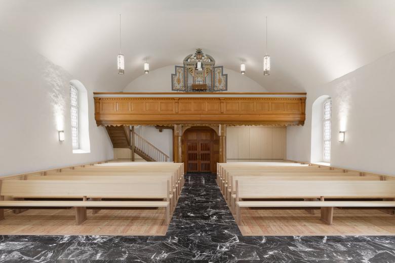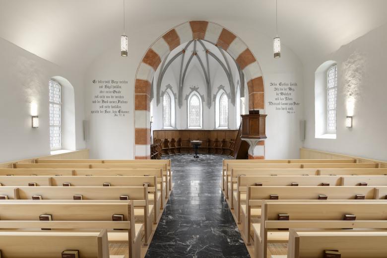 Die Kirche Sax wird zum ersten Mal 1236 erwähnt. Sie ist die älteste Kirche in der Gemeinde Sennwald und stammt aus der Freiherrenzeit. Die unter Bundesschutz gestellte Kirche (Schutzobjekt Gebäude KO G) war in ihrer Gesamtsubstanz zu erhalten. Insbesondere die Chorausstattung und die Fensterrahmungen sind kunsthistorisch relevant. Die Aufgabe der heutigen Restaurierung bestand darin, die übrig gebliebenen, qualitativ wertvollen Teile verschiedener Epochen zu einer harmonischen Einheit zusammenzubinden und dabei den historischen Charakter des Gebäudes spürbar zu machen. Auslöser für diese Überlegungen war ein Feuchtigkeitsproblem im Kircheninnenraum. Unter dem heute bestehenden Boden im Kirchenschiff befindet sich das Erdreich ohne ausreichende Belüftung oder Feuchtesperre. Die dadurch in den Kirchenraum aufsteigende Feuchtigkeit verursachte Langzeitschäden an diversen Bauteilen. Die Forma Architekten AG erarbeitete im Auftrag der Kirchengemeinde eine Machbarkeitsstudie, die zu einer Gesamtsanierung führte. Als Hauptsanierungsmassnahme kann der neue Boden im Schiff- und Chorbereich bezeichnet werden. An erster Stelle stand somit ein fachgerechter Rückbau des bestehenden Bodens. Damit verbunden der Einbau einer neuen, dichten und gedämmten Bodenplatte sowie einem neuen Bodenbelag aus Naturstein. Die thermische Isolation im Dachbereich wird ergänzt, um vor allem im Randbereich die Kondensatbildung und damit die Verschmutzung zu mildern. Die bestehenden Fenster auf der Südseite erhielten eine aussenliegende Isolierverglasung, die neben einer energetischen Optimierung auch schalldämmend wirkt. Im Gesamtsanierungspaket enthalten war zu dem die Erneuerung der gesamten Elektroinstallationen, der Audio-, Video- und Akustikanlage sowie die eigens für diesen Kirchenraum entwickelten Leuchten. Ebenso die Neugestaltung der Kirchenbänke, die Wandtäferbereiche und die neuen Schrankeinbauten unter der Empore. Der mineralische Neuanstrich der Innenwände im Kirchenschiff, die umfassende Sanierung des Chorgestühls sowie der Neuaufbau der Emporenpodesterie gehören ebenfalls zum Massnahmenpaket der Instandstellungsarbeiten.