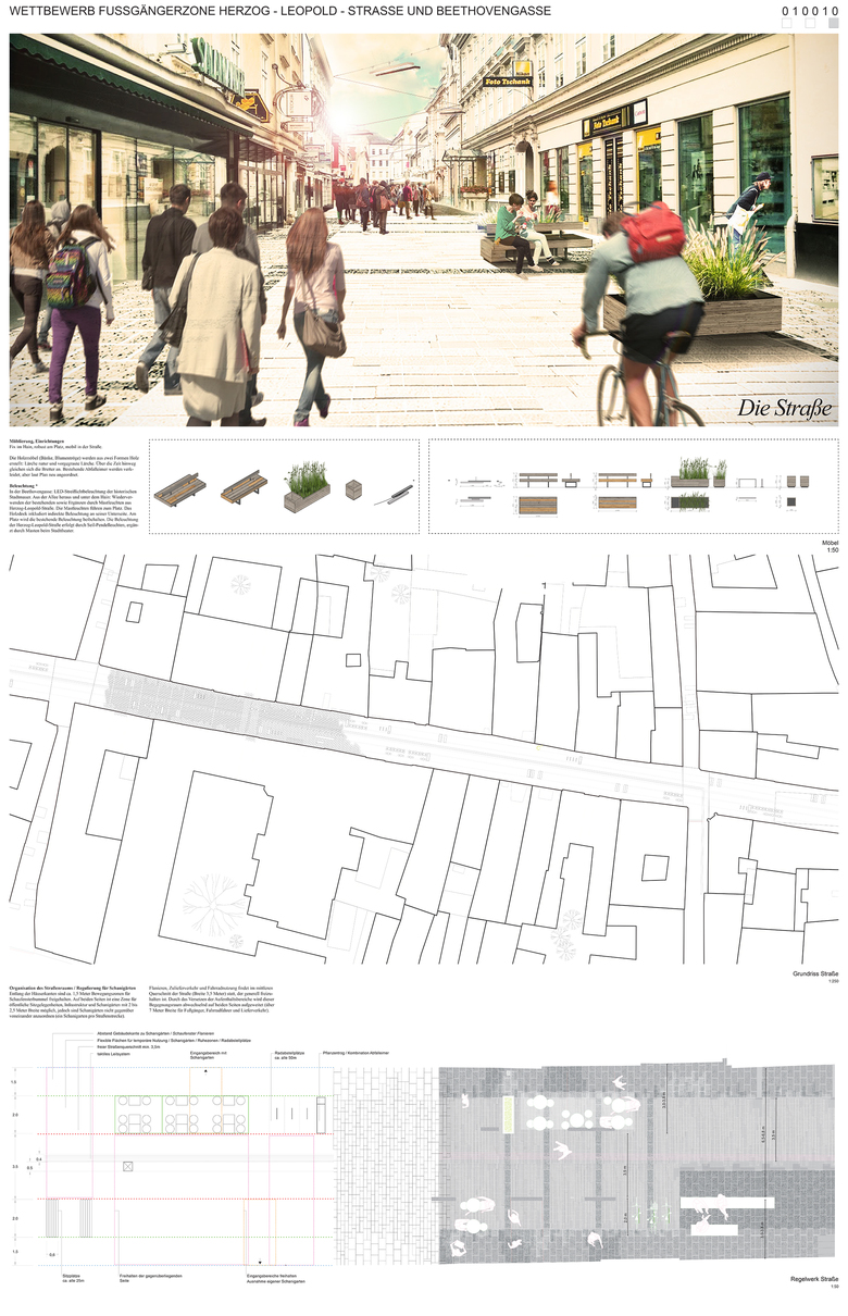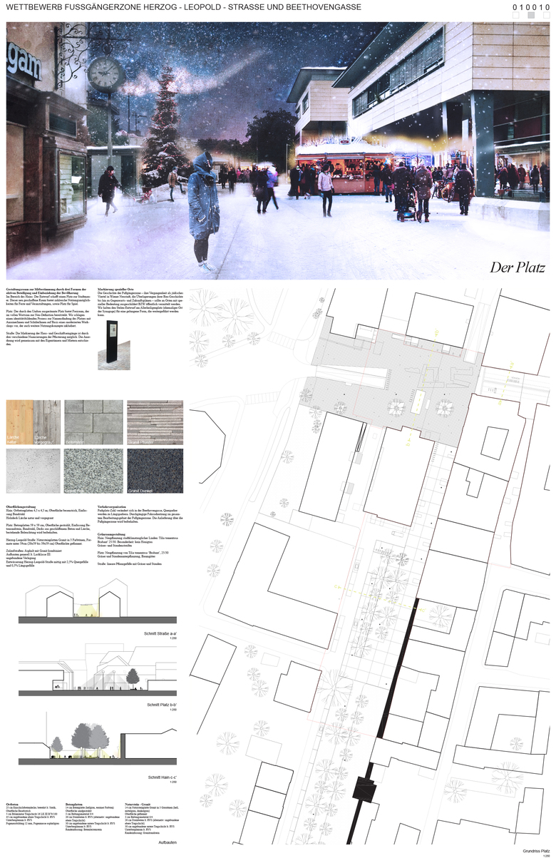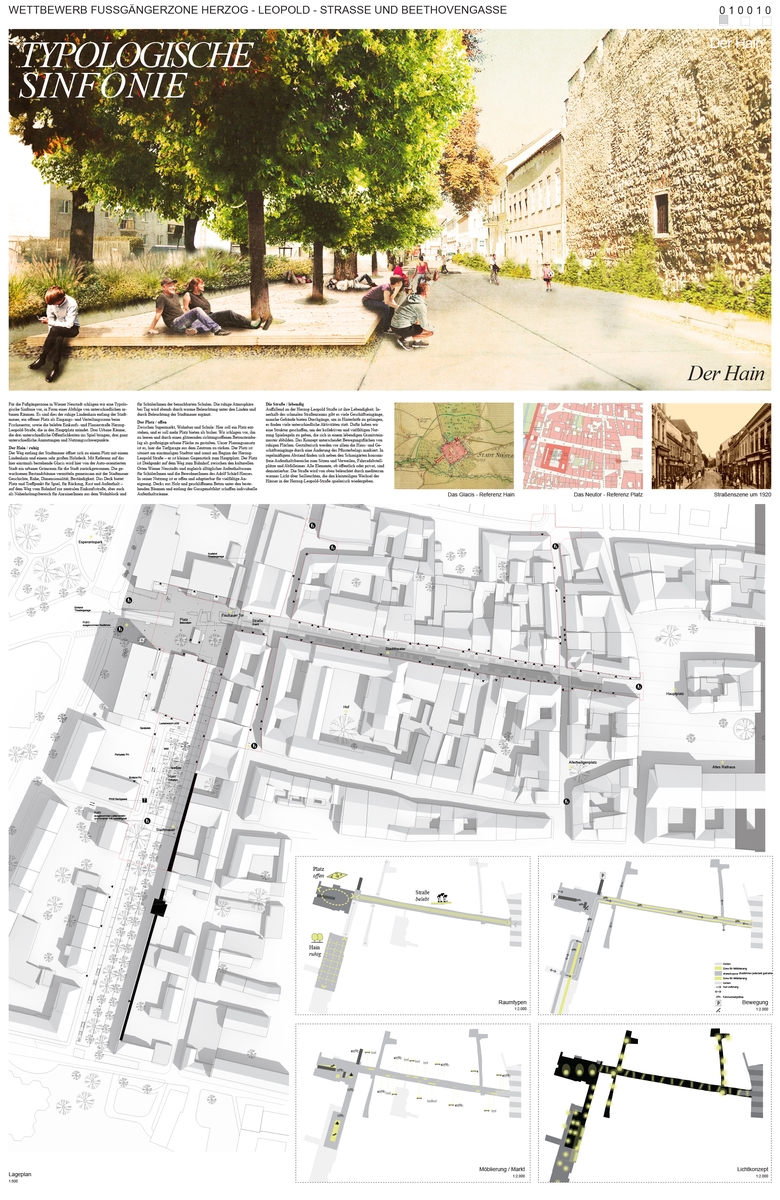 For the pedestrian zone in Wiener Neustadt we proposed a Typological Symphony, in the form of a sequence of different urban spaces. These are the quiet linden grove along the city wall, an open square as an entrance and distribution area at Fischauer Tor, and the lively shopping and promenade Herzog-Leopold-Straße, which leads into the main square. Three urban spaces that bring three different public spheres into play, three very different atmospheres and focal points of use.