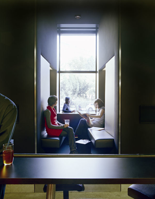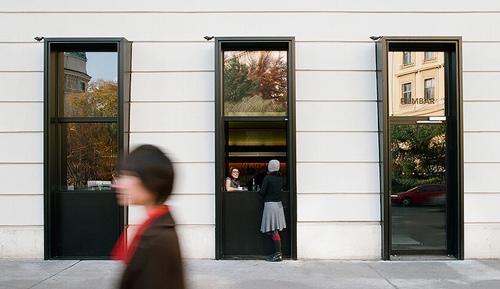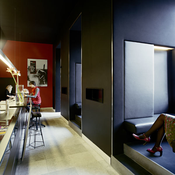 The Austrian Film Museum is famous for its „Invisible Cinema“, in which the physical space of the auditorium disappears into the black in favour of the projection to be the only space of experience in this movie theatre. The new construction for the Austrian Film Museum works complementary to the „Invisible Cinema“: Along the facade of the Albertina, which before was like an empty screen in front of the hidden cinema, the space behind the facade – the space of the cinema – is made visible. New entrances and window openings project the bar and the foyer of the film museum into the outside and play upon the motif of the blackness of the projection space proper. Seen from the users´ point of view, the modification opens the bar of the film museum to the outside, connects it as a social space to the urban surrounding. The alchoves in the depth of the Albertina´s plinth wall have been redesigned to now serve as comfortable zones for face-to-face communication, while the parapets of the windows – windows that open vertically – act as tables for the inside and bar counters from the outside. Being inside/outside at the same time marks the entire reconstruction, since all the new spaces are neither inside the building nor outside of it, but literally within the wall itself: they are openings in the two-and-a-half metre thick plinth of the Albertina. A little like cinema itself, they are opportunities to place oneself right where interior and exterior meet.