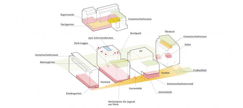 Das Schwimmbad am Dach ist spätestens seit dem Erfolg von Alt-Erlaa auch in Wien ein Sinnbild für die hohe Qualität von sozialem Wohnbau. Auch Wohn- und Städtebau für Frauen* an Lebensschnittstellen soll einen solchen Ort des Treffens und des Abkühlens beinhalten.