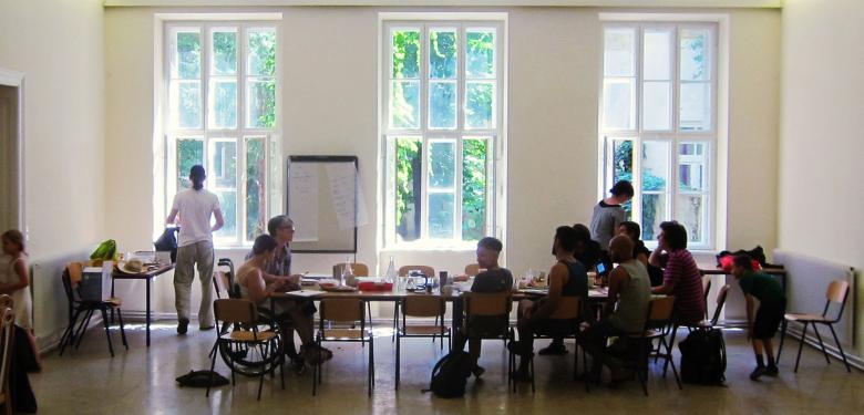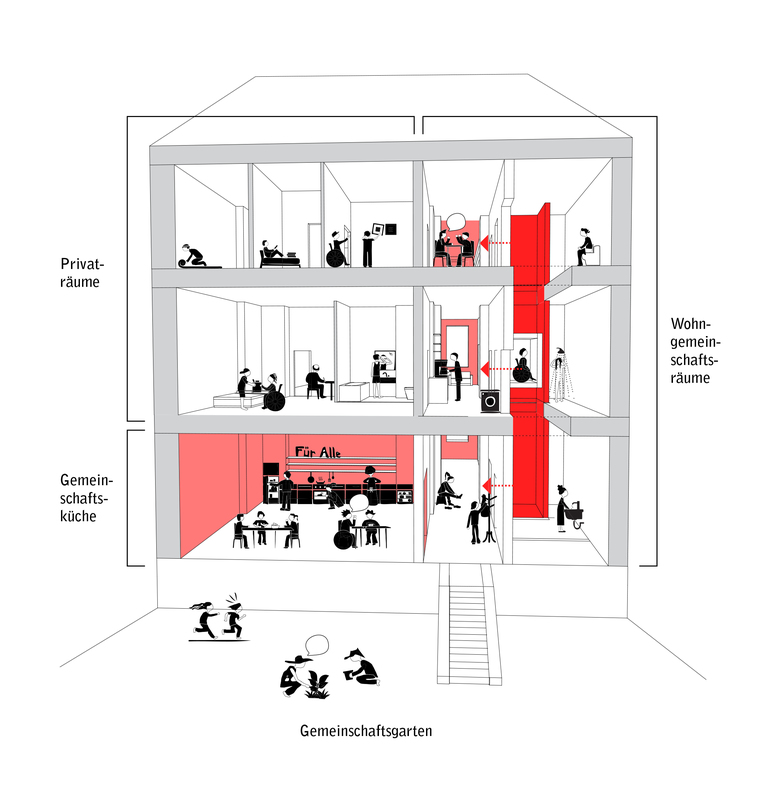 The building is an intersectional urban building in two senses. The three stories and staircase share a single, central kitchen and, rather than individual apartments, the building consists of a mixture of collectively used and private rooms. The members – and this is, along with its spatial significance, the second meaning of intersectional – come from both queer and refugee communities and have a strong sense of solidarity.