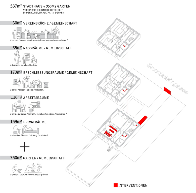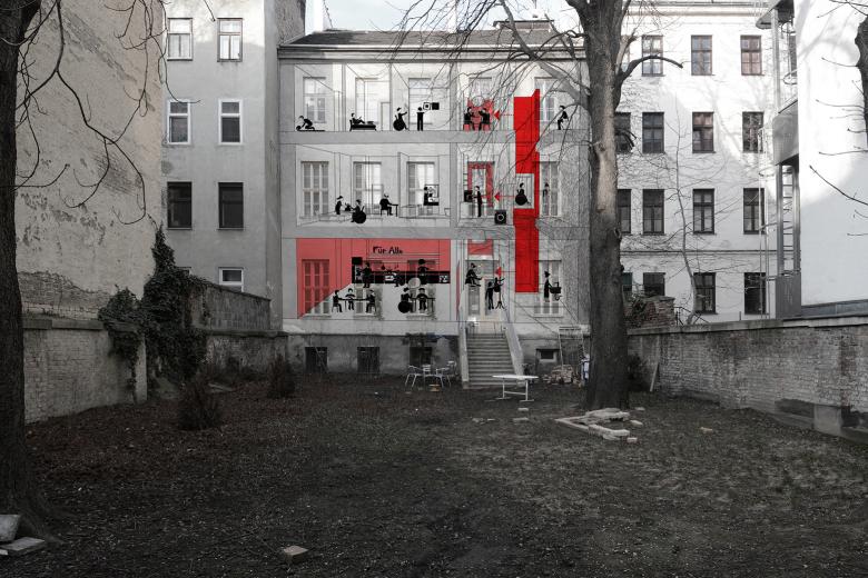 The “Intersectional city house” in Grundsteingasse is a project by a self-organised association called the Verein für die Barrierefreiheit in der Kunst, im Alltag, im Denken (Association for the Removal of Barriers in Art, in Everyday Life and in Our Heads). The association has as its goal not to invest in the ownership of property, but rather to develop and, then, experience a new form of house- and association-based community. This is not an example of emergency housing or of improvising affordability, but the building of a way of living together.