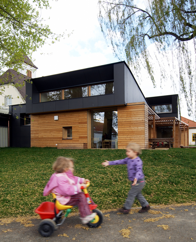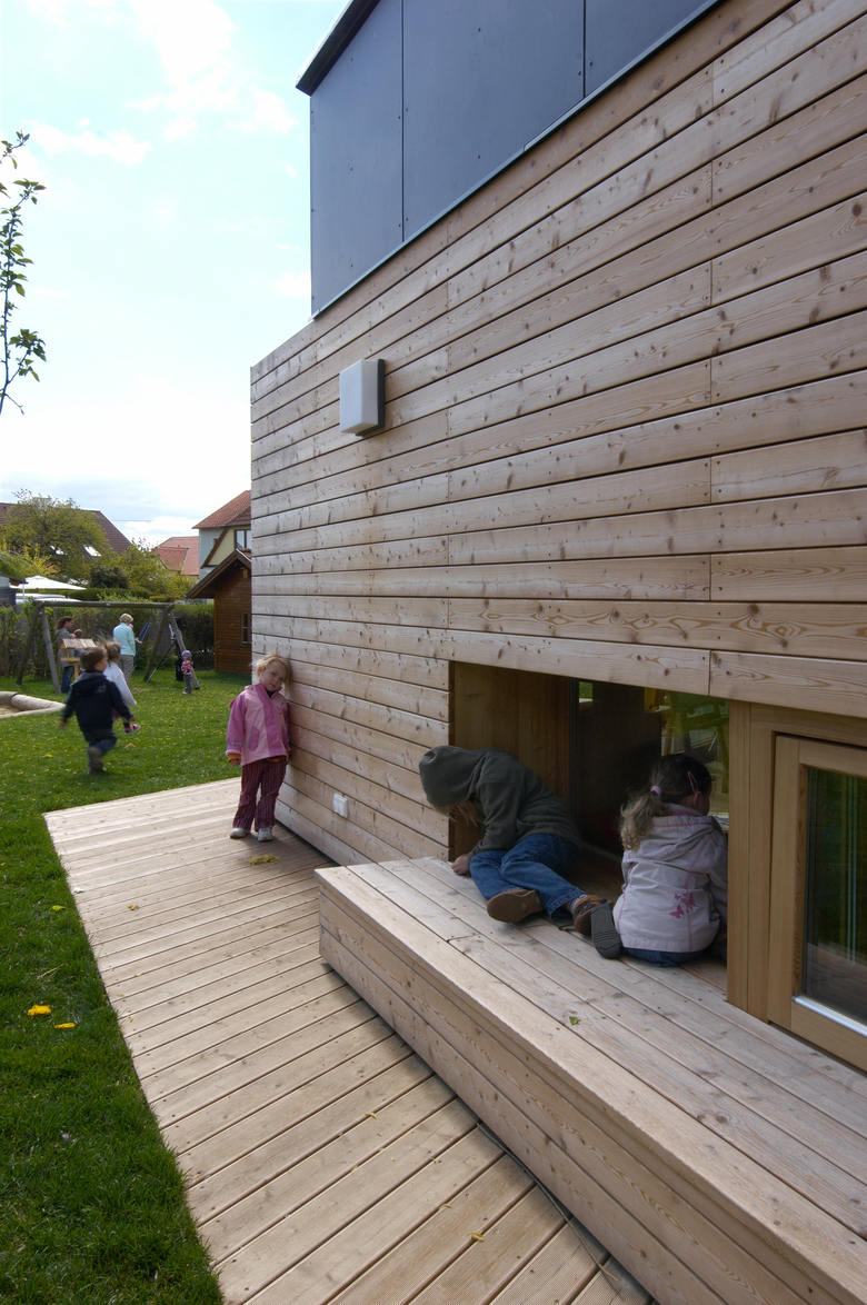 It goes without saying that the new kindergarten structure is developed as a low-energy-building. Ecological requirements are, however, balanced with issues important to the pedagogical concept of the kindergarten: the leaving of materials untreated and raw, the placing of the building into the landscape according to urban necessities and directions of the sun, the creation of differentiated spaces between inside and outside (using better insulated glass rather than reducing the window size).