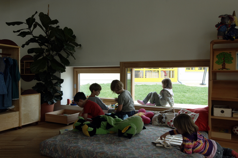 These quite old trees were to be built around since from the beginning of construction. They were meant to serve as a "Wall for all Seasons", shading in summer, leave-less in winter to have the sun shine deep into the kindergarten.