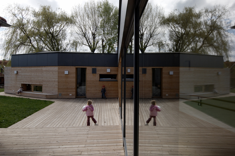 The conceptual horizontal split of the building into the children's scale and the urban scale is translated into volume and material: in natural wood and widely open to the garden, the children's part is the plinth to the contextual scale of the roof-landscape, which opens the spaces to the sky and to the Southern trees through roof windows.