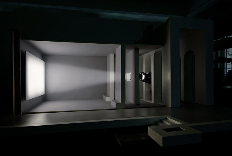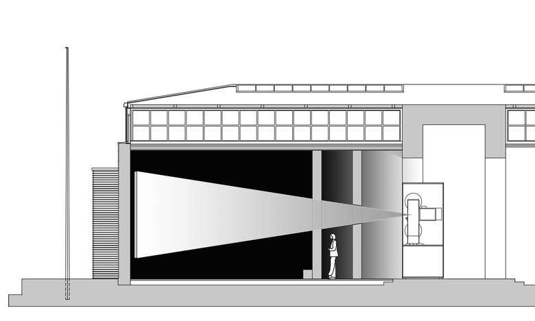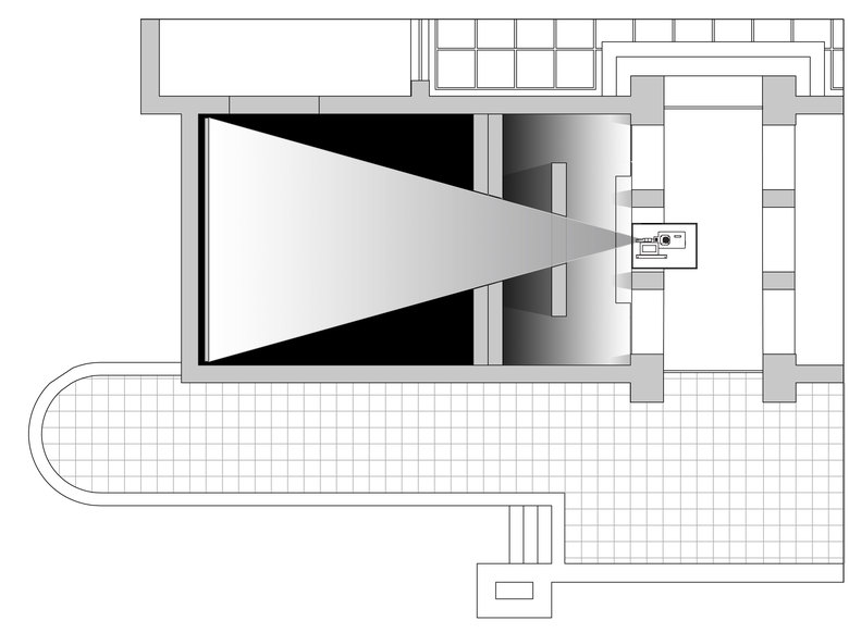 It was planned and built as a space that filters out sunlight, while opening itself to the screen projection – with the walls adapted tightly to the light-cone: creating the same spatial opening for the light-cone as for the viewers.