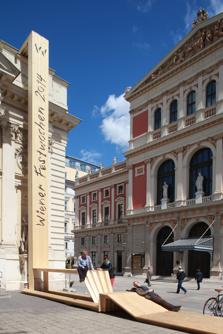Wiener Festwochen, the annual six-week-long cultural festival of Vienna, commissioned the sculpture outside the festival center in the Stadtkino im Künstlerhaus. As with many of Vienna’s public spaces, this is a contested site: for years it has been defined by building-scale advertisements in front of the Künstlerhaus, an independent art society. In order to raise money for the renovation of their historic building, the Künstlerhaus constructed a scaffold to extend the facade into this unique space, remembered as a lively urban moment in Vienna before its transformation. This is also the only outdoor space for the students of the high school next door. Our sculpture addresses the leftover space next to this scaffolding and tries to reframe this public place as a non-consumerist space.