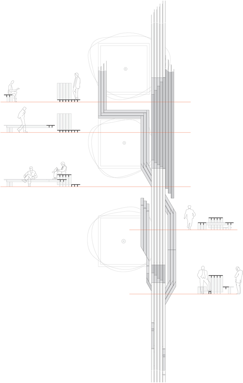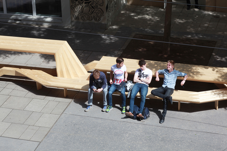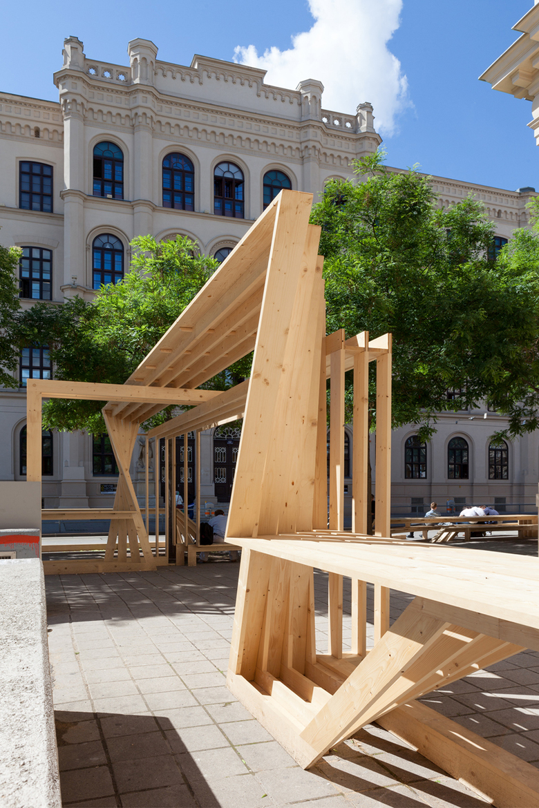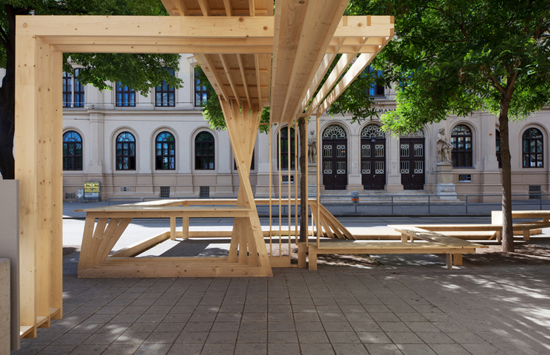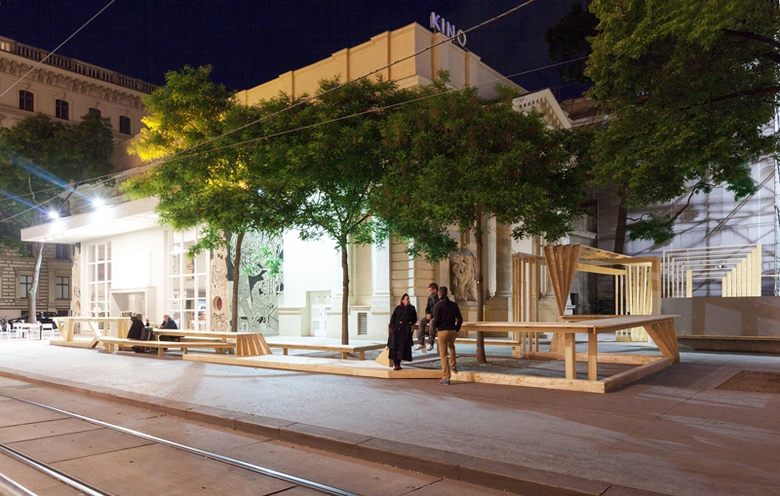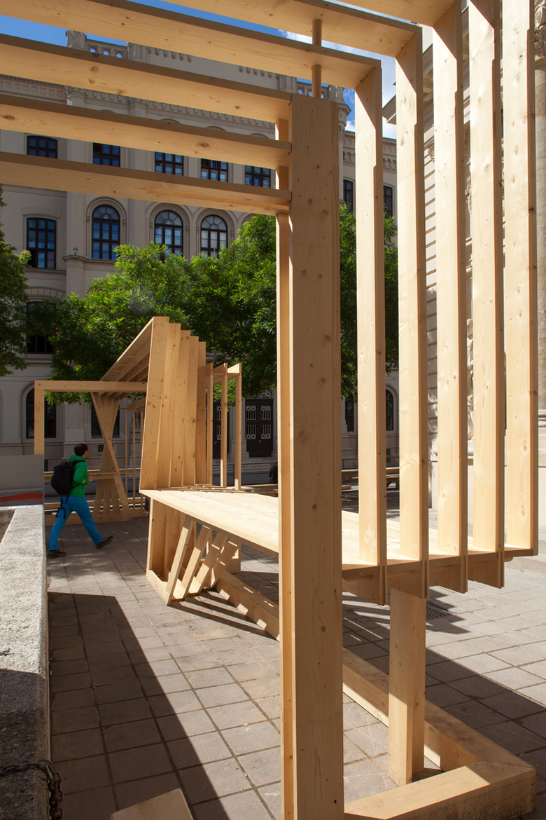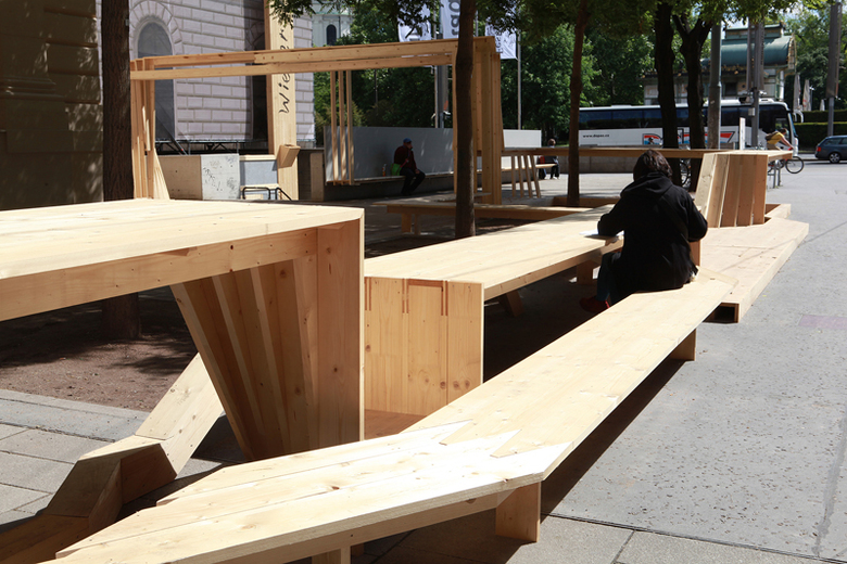 It actively encourages the students of the school, festival guests, or any passersby to hang out in the streetscape without the need to look for a sidewalk café. Because of its irregularly differentiated form (in the usual and unusual relationships between table, bench, and pergola) the installation tests different uses in its various spatial subconfigurations. The 121-meter-long structure is built from identical plates of raw spruce, connected by specific timber joints and screws without any glue. In this sense it is a test for using raw spruce in public space. And as an art piece, it in turn tests the potential of the site. As expected, many people including the pupils used it, but none of the anticipated graffiti, engraving, and use by skaters or traceurs happened in a measure worth mentioning—which may be due to the prominent location of the site. I also learned from passersby and my own behavior that we are not used to spending time so conspicuously without consumption, on unusual public furniture within the center of a city like Vienna.“