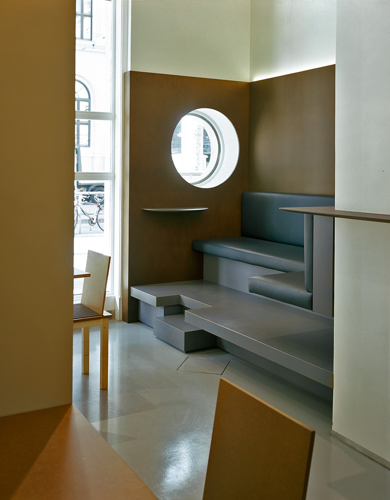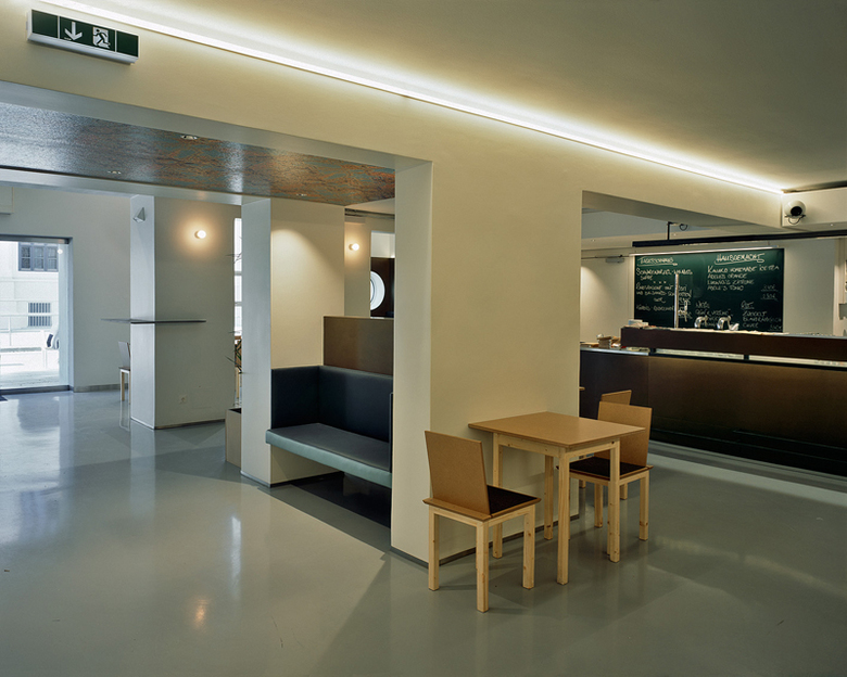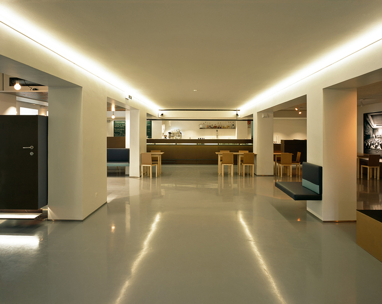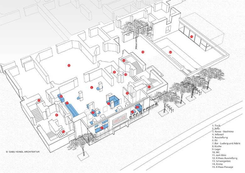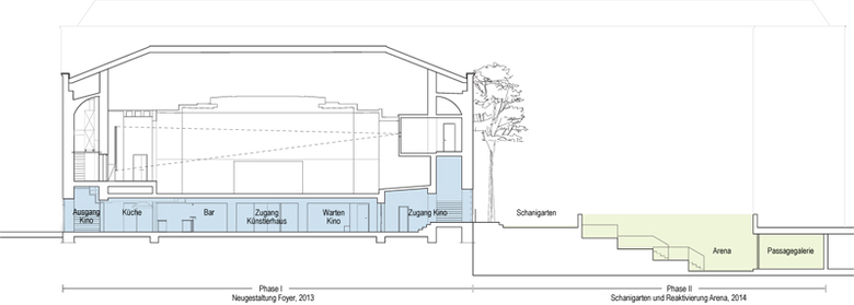 The urbanistic and architectural concept defines the cinema foyer as a public space - by extending the street and public space from the Karlsplatz right into the lobby, even further: by understanding the cinema foyer as an exemplary form of transitory urbanity. The inside becomes part of the outside space and vice versa. Part of the experience of going to the cinema, e.g. the wait before the movie may just as well take place under the larch tree outdoors (which before the remodeling was hidden for years behind fake scaffolding).
