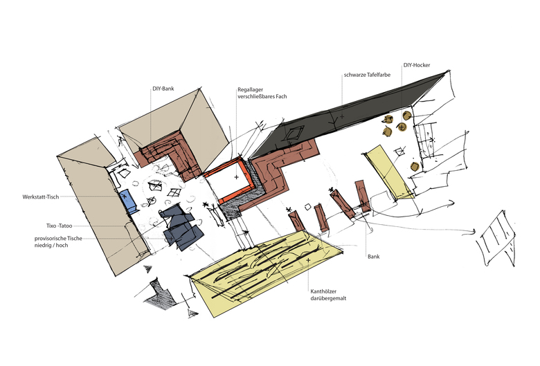 Five debate spaces, designed by visual artists, turn the exhibition into a forum and contact zone.