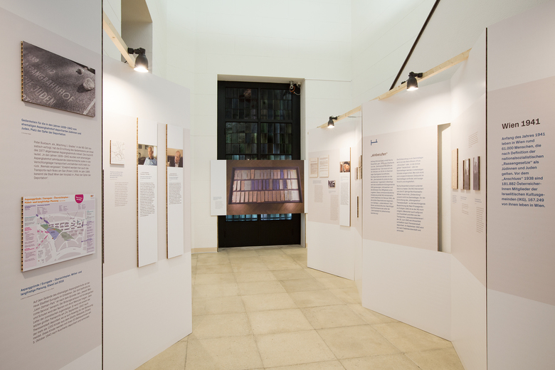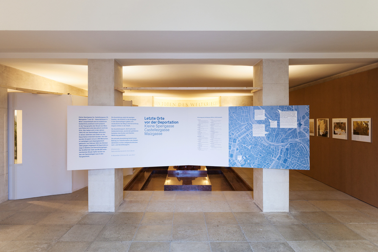 The exhibition site, the Crypt of the Heroes’ Monument, is dedicated to the Austrian soldiers who fell in World War I and II. The exhibition confronts and juxtaposes this ensemble of remembrance with the commemoration of the more than 65,000 Austrian victims of the Holocaust.