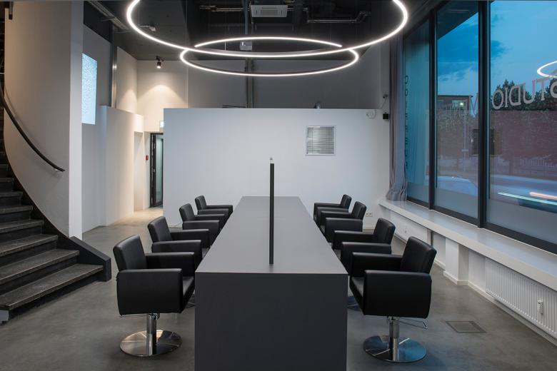 The reception area, mirrored tables, furniture, accessories and materials such as curtains and surfaces, including the color scheme, were planned and executed in close collaboration with the owner. For lighting, the choice was made for a solution that corresponds to natural daylight. For the surfaces, the specific stresses caused by the work equipment commonly used in a hair salon had to be taken into account.