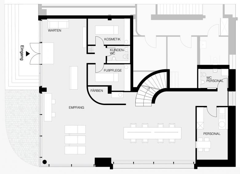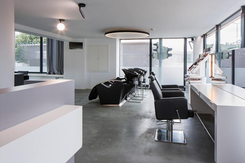 The salon is housed on one level and is located on the first floor directly on the corner of a busy street intersection. The central guideline in solving all design issues: the customers are always in focus. Interior design, lighting ambience and simple furnishings support and sharpen attention.