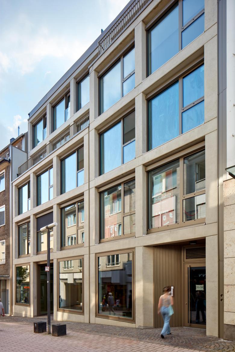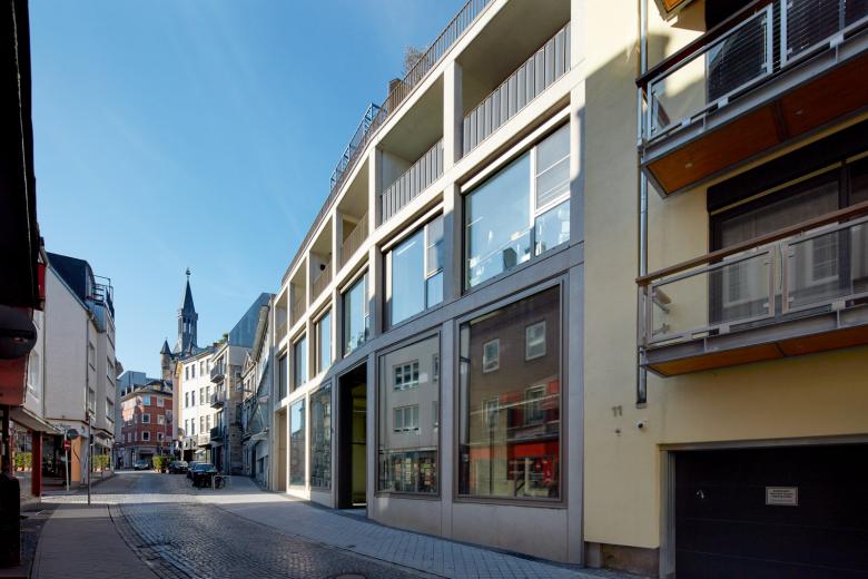 A building with three different uses is being constructed in the historical centre of Aachen on a parcel that is accessible from both sides. This will create 24 residential units, 2 office units and a large retail space on the ground floor. Its external appearance reacts in line with the local situation as regards urban development, transporting it into the 21st century through a modern, three-dimensional framework facade.