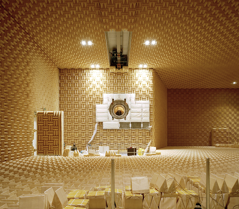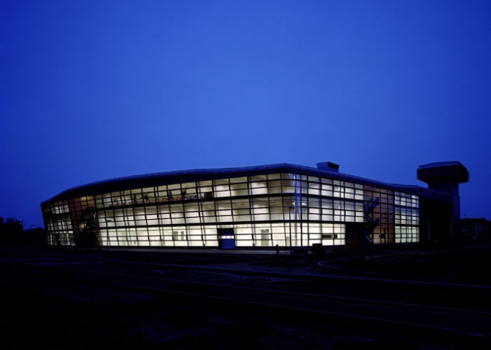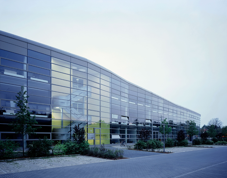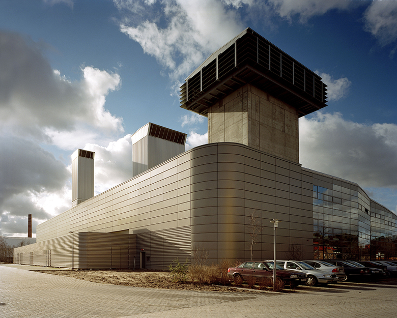 The “Centre for Aviation and Space Technology” in Wildau was designed as one single aerodynamic body. Located near Schönefeld Airport, Berlin, the building contains technology of the highest standard. It is here that Rolls Royce develops and tests their aircraft engines in high-tech test stands simulating all possible flight and height conditions. In addition, students of Wildau Technical College may also gain practical experience here. All appliances and its various complex installations are concentrated under a silver streamline aluminium shell. Thanks to inserted glass structures guiding the light deep into the office levels, the building is far from being a hermetic monolith, but rather represents a lively focus of movement and communication. Unexploited industrial land has thus successfully been revitalised and has gained unique visible prominence by three mighty turbine hall exhaust towers at the back of the building.