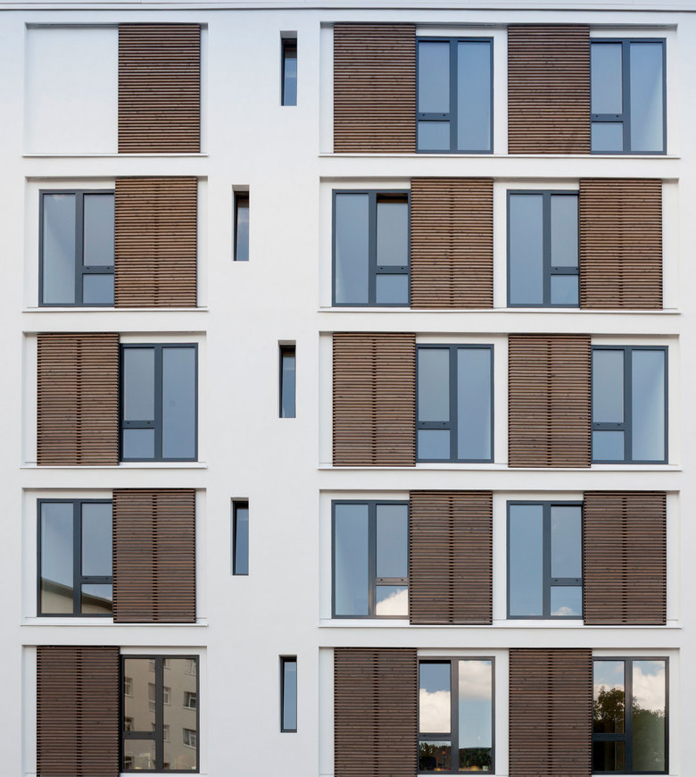 The sliding elements on the windows provide a vivid and playful appearance to the façade in spite of the rigorous and logical disposition of the openings.