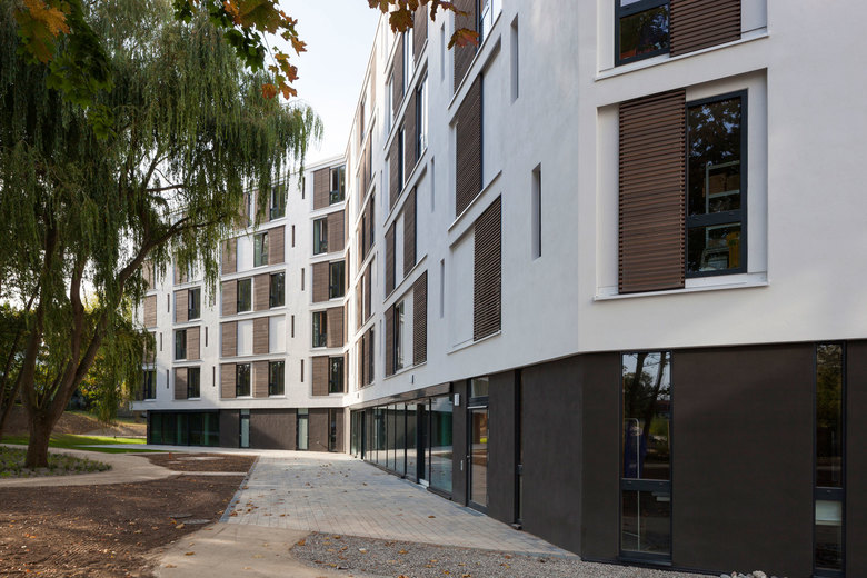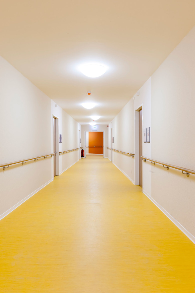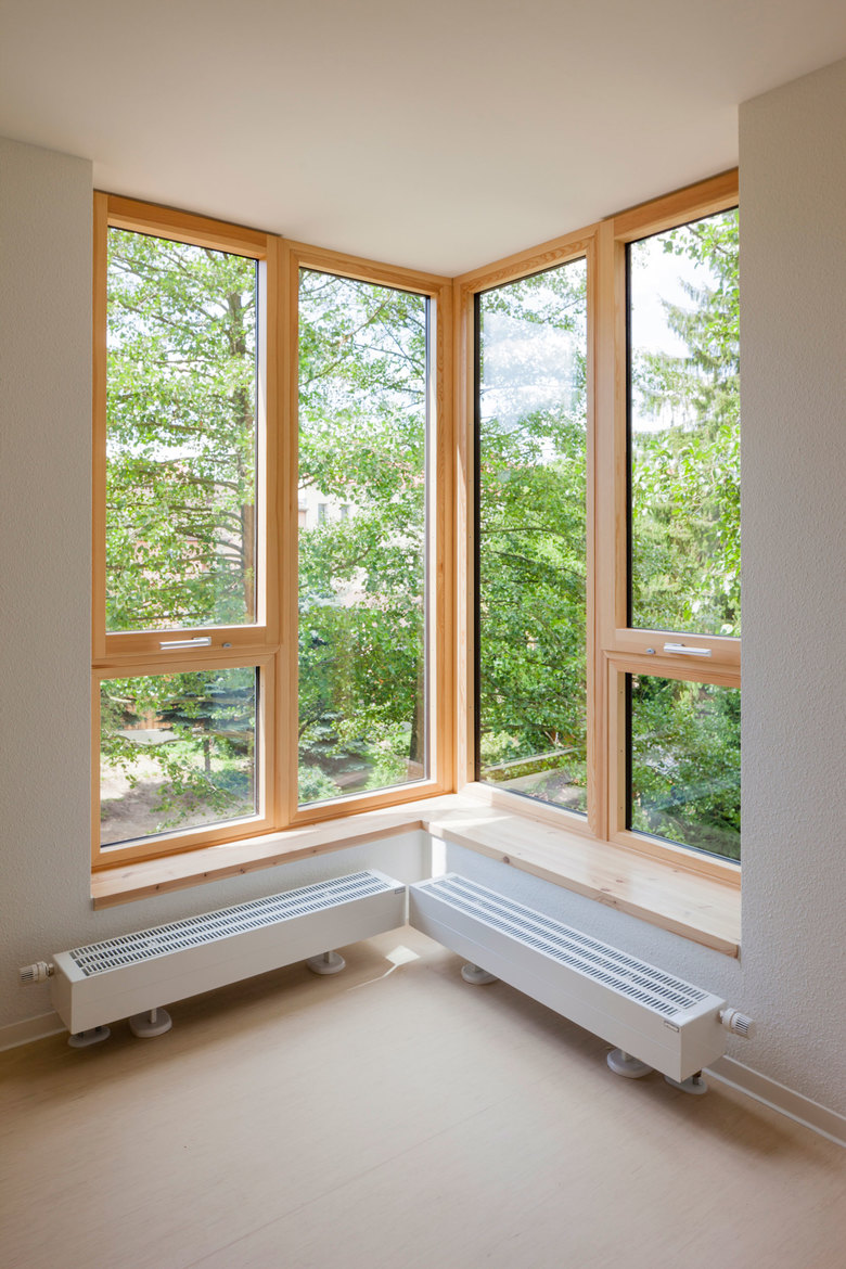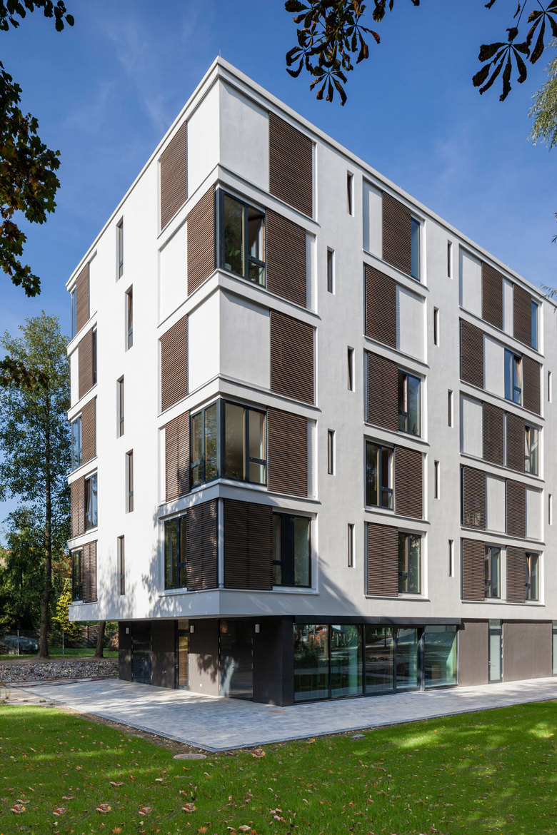 Each unit features generous windows to allow the residents unobstructed views to the park, taking reduced physical mobility into account. Elegant wooden sliding shutters help control natural lighting, whilst still allowing visual connection with the surroundings.