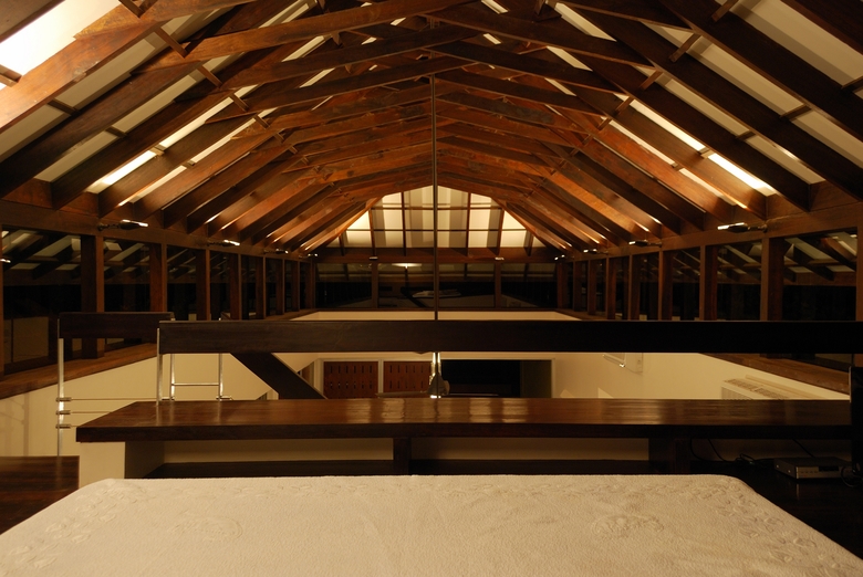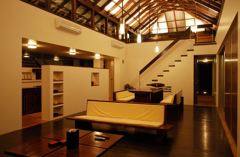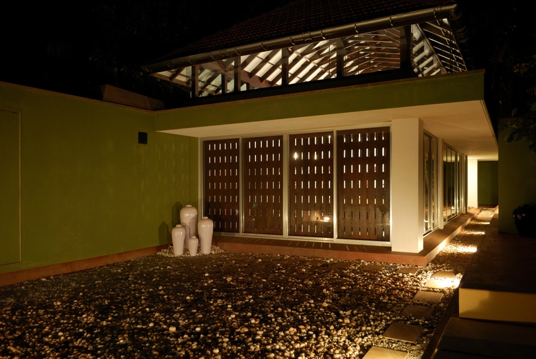 Adding to the intrigue of this opaque massing is a glazed slit opening, a little below the slab, running full lengths on both the arms. The slit climbs down to mark a comma on the long north face, growing into an enticing louvered window. A tower – containing the overhead water tank, air conditioning compressors and other utility – anchors the north-east vertex. An RCC lintel slab with thick inverted beams runs all along the building’s edge. It floats on RCC columns punctuating the south side of the living space, affording a large opening to the west. The fenestration renders further weightlessness to the building by reflecting the sky and the trees during day and imparting a filtered glow at night. A sweeping Mangalore-tiled gable roof, with a dramatic structure constructed purely out of wood, forms one large mass encompassing the inner living spaces; its rafters are braced with plywood to avoid obtrusive ties that would otherwise run across the spaces below. The large roof does not sit directly on the mass. Instead, it forms a sliver through a glazed wooden girder running all around its perimeter. Thus, in seeking a built form in trance, the earnest plan became intensely animated – offering varied scales and textures, light and vistas, and spaces.