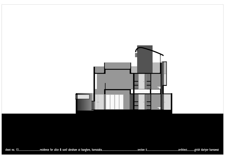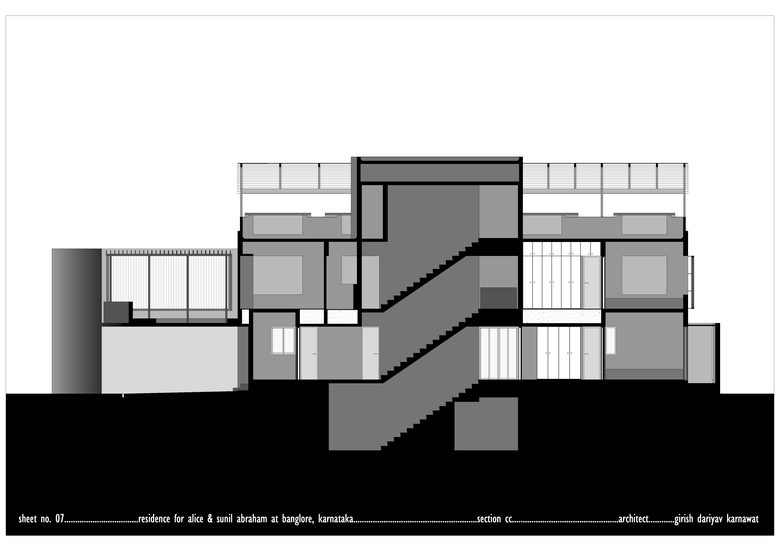 The entry was located from the garage on the north-east of the property with access to a small office space and family entrance to the house.Living/dinning/master bedroom/kitchen with associated services formed the plan configuration on ground floor with children's bedroom/study/guest room/family room forming the layout on the first floor.Owing to the density a conscious attempt was made to lighten it up by inserting courtyards,verandahs and opening up facades and engaging the external spaces between the outer layer and boundary walls..