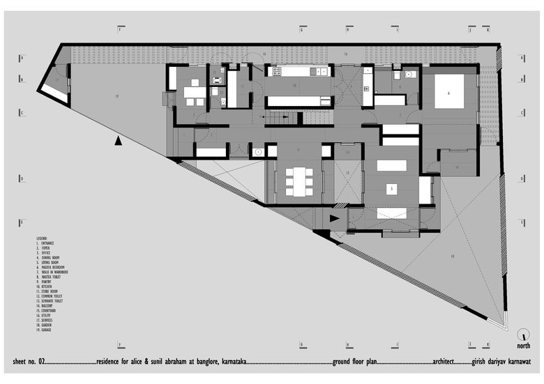 The odd shape of the plot flanked on two sides with vehicular arteries, the need of visual privacy from the neighboring built form,elaborate functional requirements that resulted in high density built mass owing to the building bye laws along with superimposition of traditional code of "Vastu Shashtra" gave rise to a very pragmatic manifestation of design processes.