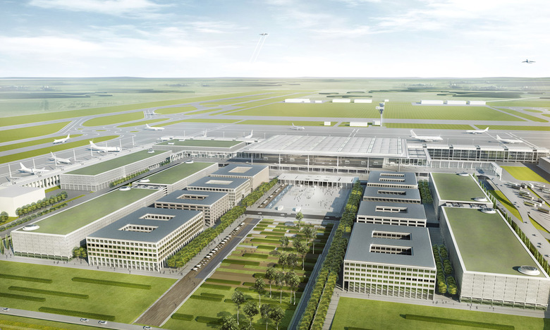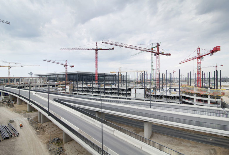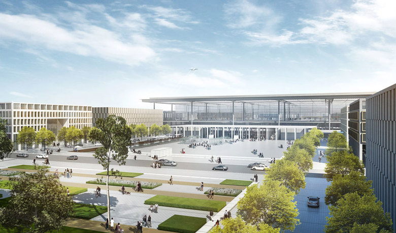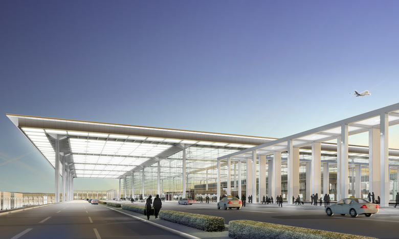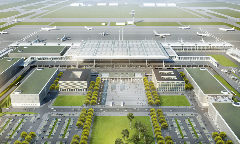 Changes in Berlin’s airports in 2012 will see the present main international airport Tegel closing and a new Berlin-Brandenburg Airport opening. The spine of the new airport is a central axis of parallel takeoff and landing systems on an east-west alignment. The main access fea-tures are arranged accordingly. The new passenger terminal consists of a main hall and adjoin-ing pier buildings. It is divided into two levels, separating arrivals and departures on the land-side. The main level is Departures, designed as a spacious, light-filled hall spanned by a filigree steel-and-glass roof. With its articulated facades and clear, geometrical shapes, the terminal incorporates architectural features from Schinkel to the Bauhaus.