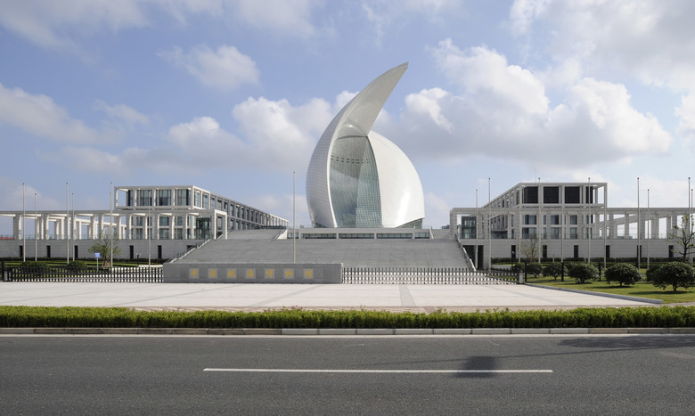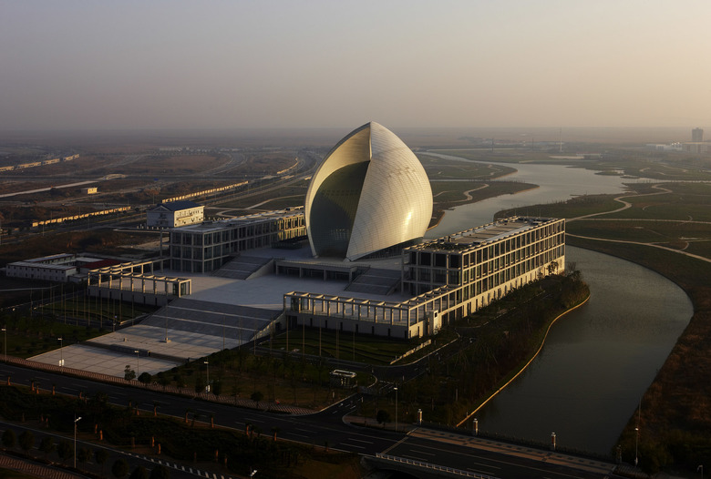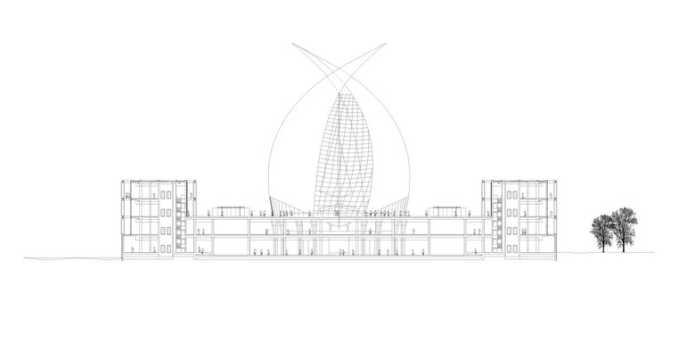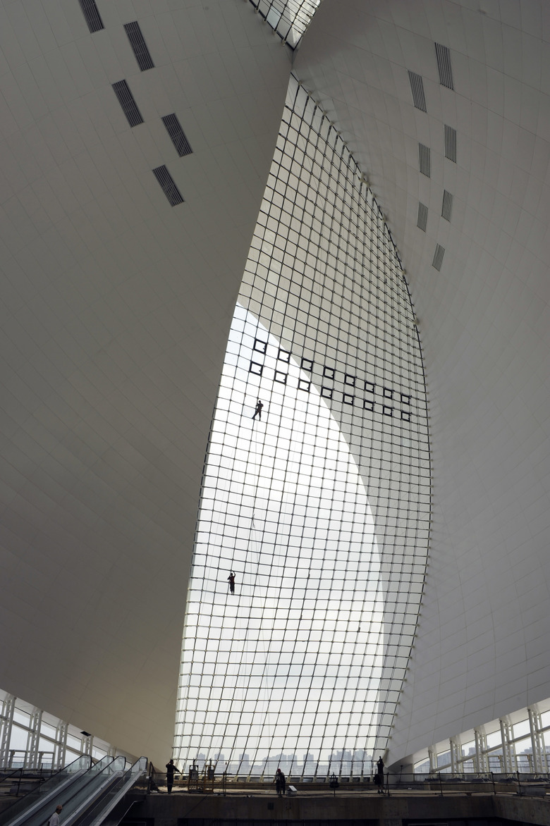 China’s first ever Maritime Museum is situated on the shore of a five square kilometer artificial lake that has been reclaimed from the Sea – the lake being the core piece of the new city development. The analogy of a ship in a port is developed further in the symbolism of the two “sails” with a height of 58m each located almost in the middle of the museum square. The enormous cathedral like interior space allows the display of a fully rigged junk.