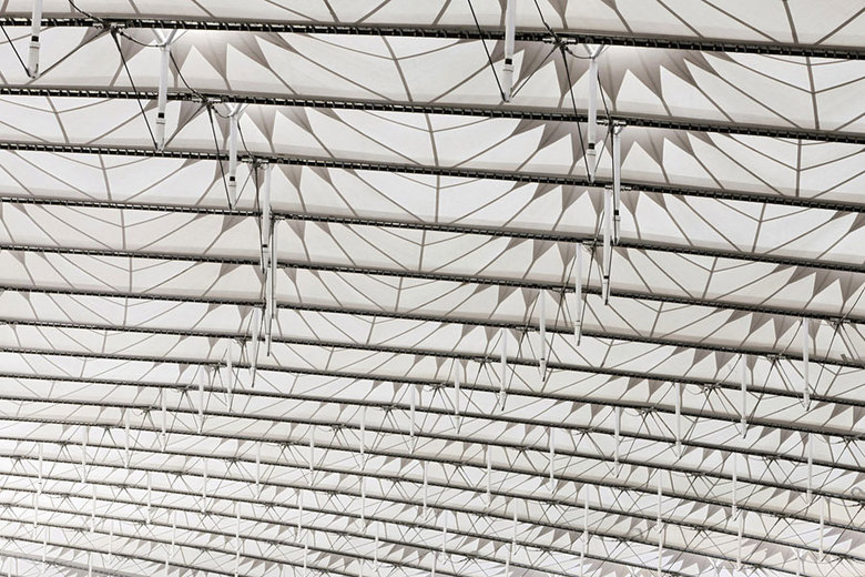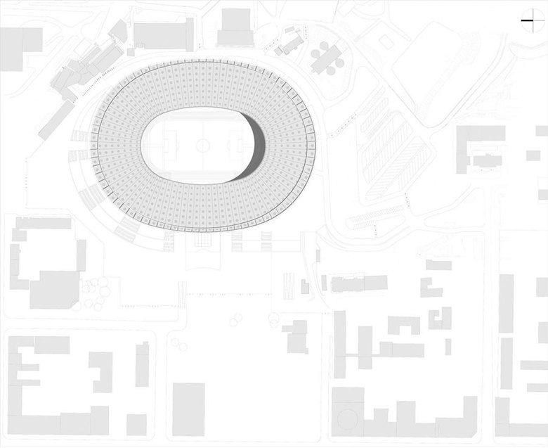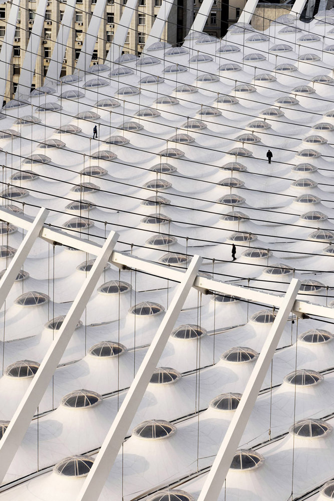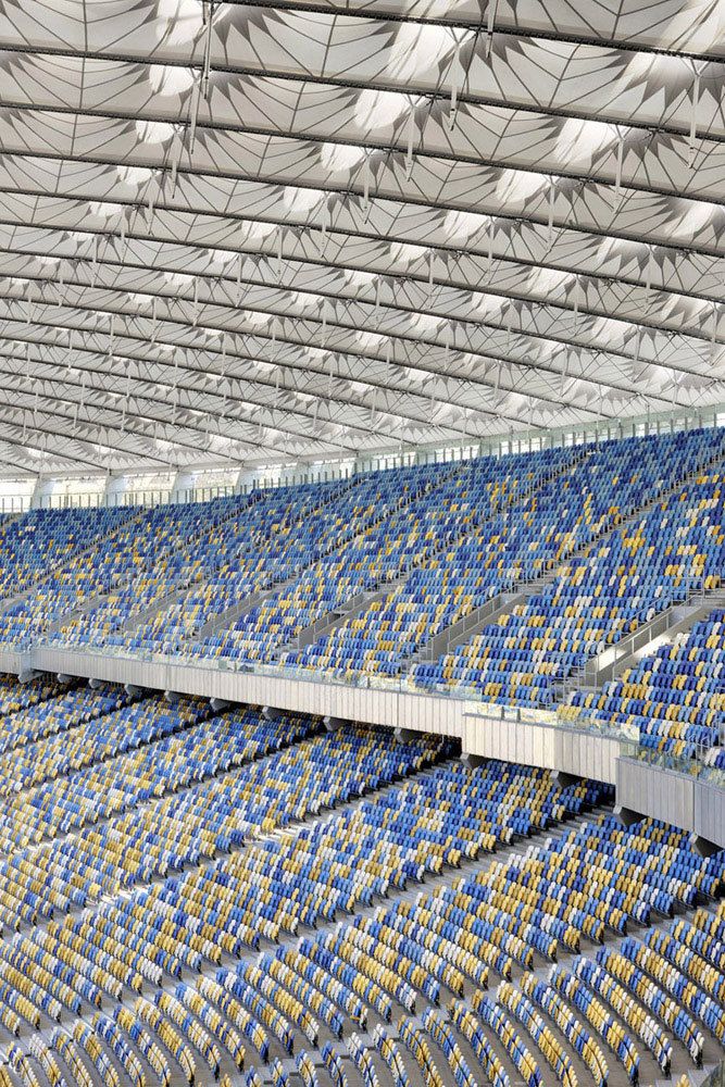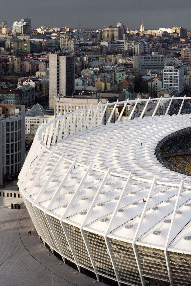 The new design for the reconstruction of the stadium respects the historic fabric with its important filigree prestressed concrete upper tier built in 1968, the frame of the new roof structure being detached and placed clear of the existing bowl. This most distinctive feature is therefore being encased in a new filigree glass façade and will be duly illuminated with appropriate lighting. The plinth structure of 1948 arising from the location of the stadium on a slope at the West End also was rebuilt in a different guise during reconstruction. The geometry of the lower part of the stand was completely redesigned and updated in accordance with safety requirements. Particularly at the west end of the stadium, beneath the main stand, extensive premises were constructed for players, VIP guests and press representatives. After the conclusion of the European Football Championships in 2012, an athletics track will be inserted, enhancing the functionality of the stadium. When the glazed structure of the stadium is illuminated at night, it is an urban landmark in the cityscape of downtown Kiev. The interior of the stadium, with seats for around 68,000 people, gains an individual, unmistakable identity with a membrane roof structure incorporating air supports and domes of light.