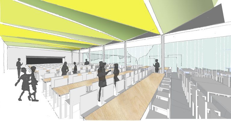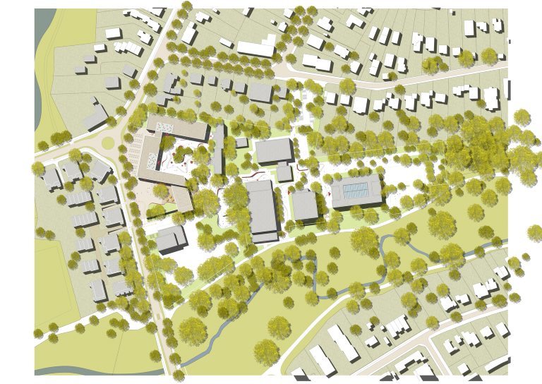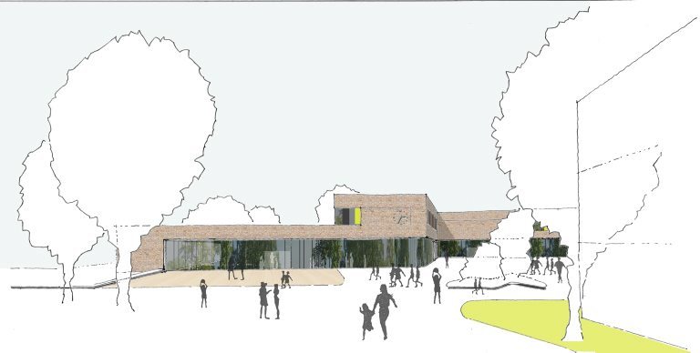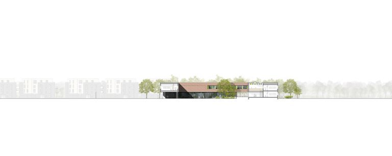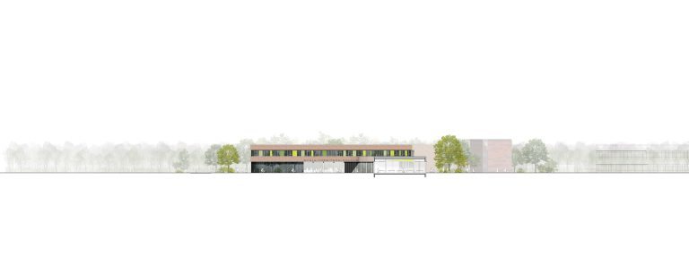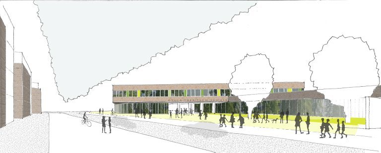 The elevation of the meandering building will be structured by an interesting interplay of elegant all-round fenestration bands and generous, recessed and framed openings on the ground floor. These openings lead the way to the entrances, but also grant vistas into the foyers, the workshop for drama and dance which can be extended to form an assembly hall, the music hall and the common room/refectory. The building is provided with rhythm by the all-round fenestration band. The child-friendly feel of a modern educational establishment is created by the varied color scheme and light effects. Gently designed exterior spaces have been proposed in deliberate contrast to the strict geometry of the new building. It is intended to use the various trees to break up the new schoolyard, with benches provided as seating around them. In addition, it is possible to set up play equipment and provide quiet spaces in the schoolyard – it should be possible to make flexible and varied use of the open spaces to the best possible extent. In addition, a new generous entrance area will provide enough space for an outside terrace for the refectory and hence space for school parties, performances and other open-air events.