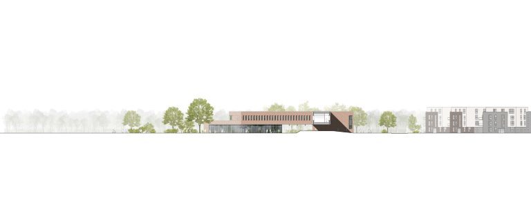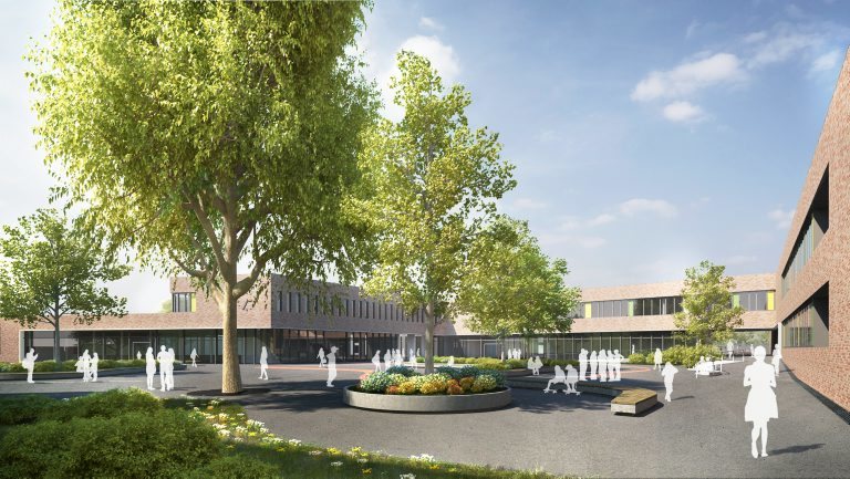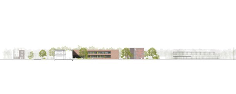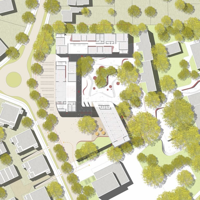 In order to retain as much of the existing vegetation as possible, the new building will be laid out in a meandering fashion. On the one hand, this layout configuration is intended to frame the outside entrance and, on the other hand, it will provide an additional schoolyard towards the campus. The shape of the building clearly expresses the three main parts – the classroom tract, specialist subject rooms and the student common room/refectory – each with independent access. The bright red facing brickwork of the façade of the new building replicates the pattern language of the former building, the neighboring new buildings at Sonnenweg and the refurbished old buildings, which all contain shades of red brickwork elements.