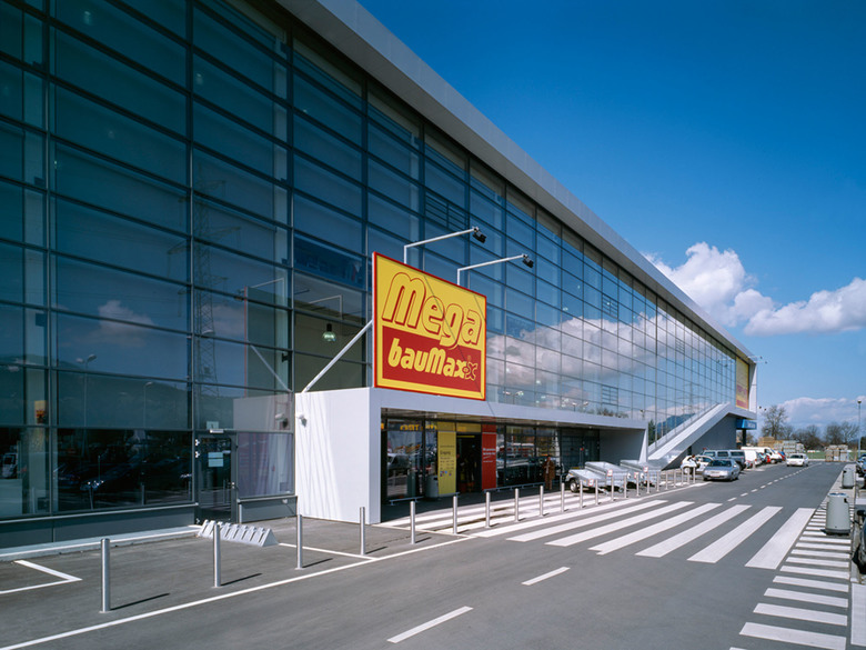 Eine große Handelskette wie Baumax betreibt professionelle Kundenerforschung und plant in eigenen Abteilungen Abläufe und Warenpräsentation bis ins kleinste Detail, wie Lagerregalmillimeter und Schriftart der Preisschilder. Der Handlungsspielraum der Architekten ist im Innenleben eingeschränkt. Auf die große Form, Struktur, Erschließung und Ausrichtung des Gebäudes bleibt die Konzentration gerichtet, über die Gestaltung eines Restaurantbereiches zum Beispiel, muss man sich keine Gedanken machen, das ist anderen überlassen. Die verglasten, offenen, freundlichen Seiten im Süden und Osten schauen zur Stadt. Geschlossen, aufgeräumt, mit Fassaden aus Blech stehen die übrigen Fronten zur Autobahn. Im Baumarkt, der jeden Zentimeter nutzt um den Patchworkteppich des Produkte-Sammelsuriums auszubreiten, ist Orientierung und Raumempfinden wesentlich. Über den doppelläufigen Rollsteig entlang der Glasfassade ist die imposante Größe des Bauwerkes zu erfassen und erleben. Großzügig wirkt auch der zweigeschossige Teil des Gartencenters im Süden. Die übrigen Abteilungen -Schwerlastabteilung im EG, Werkzeuge und Raumausstattung im OG - sind einstöckig. Wer in den Regalschluchten verloren zu gehen droht, orientiert sich nach dem Lichteinfall. Bei der Betonfertigteilkonstruktion der Halle wurde jede Stütze statisch optimiert. Stützen und Träger variieren in der Dimension nach abgetragenen Lasten. Um den Außenbereich der Gartenabteilung geordnet zu halten, wird die Fassade als uneinsichtige Innenhofwand weiter gezogen. Die drei beabsichtigten Werbewürfel am Dach des Gebäudes konnten auf einen – kleineren – reduziert werden.