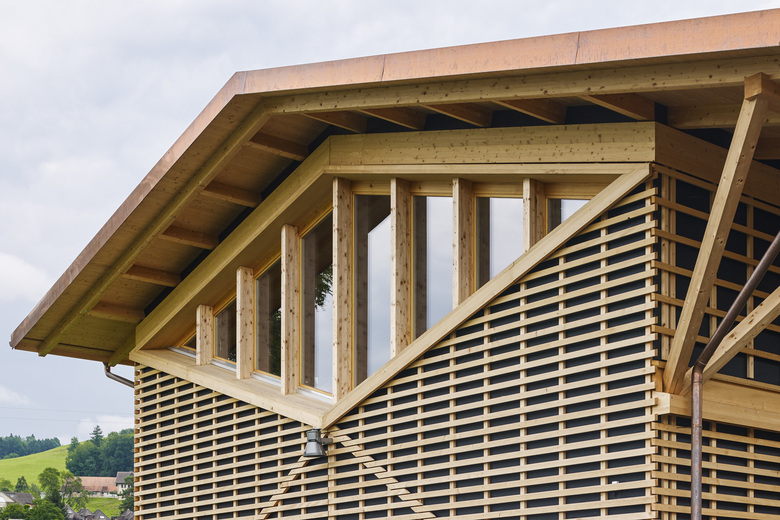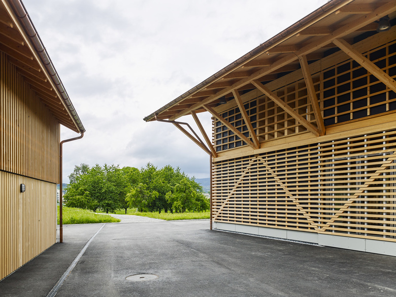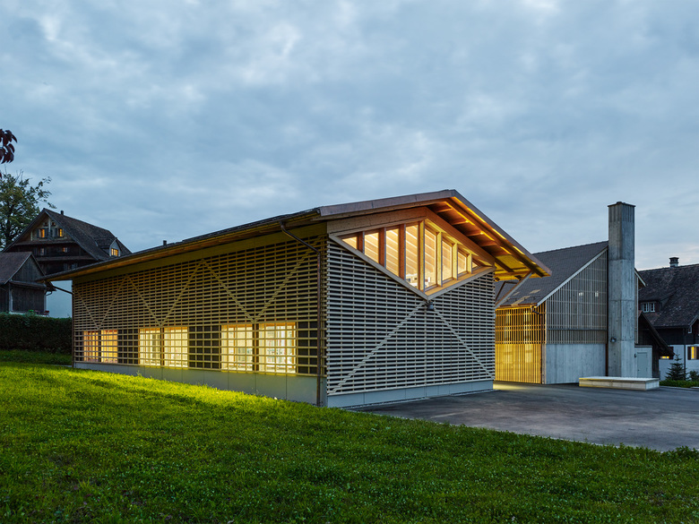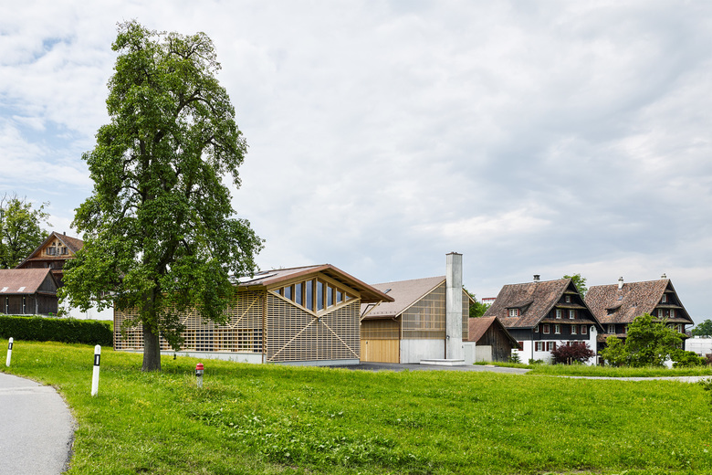 Im historisch bedeutsamen und längst inventarisierten Ensemble eines Zuger Gehöftes aus dem 17. Jahrhunderts gilt es, eine Remise und eine Militärbaracke aus den 1960er Jahren zu ersetzen / Zwei Bauten mit neuem Programm, eine Schreinerei mit Restaurationsatelier und eine Heizzentrale mit Büros und Autounter-stand, werden hierzu neu erstellt / Ihre Stellung und markante Dachform, ein auffälliger Betonkamin und das Baumaterial Holz in zeitgenössischer Anwendung und sorgfältiger Detaillierung prägen die neuen Bauten / Dabei werden zwei grosse Fensteröffnungen in den Giebelseiten des Ateliers zu eigentlichen „Schaufenstern“ ausformuliert, die dem Ensemble eine spezifische, weitherum sichtbare Prägung verleihen.