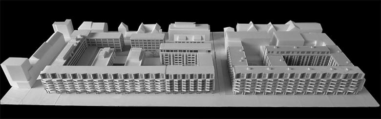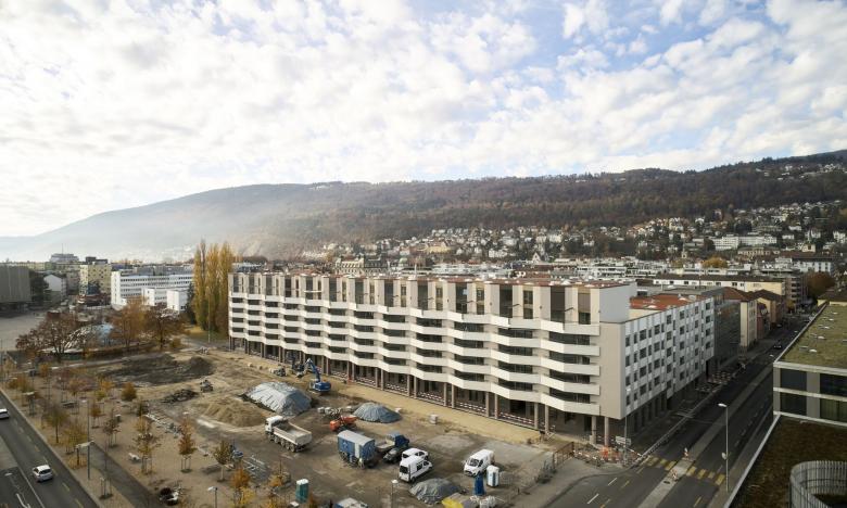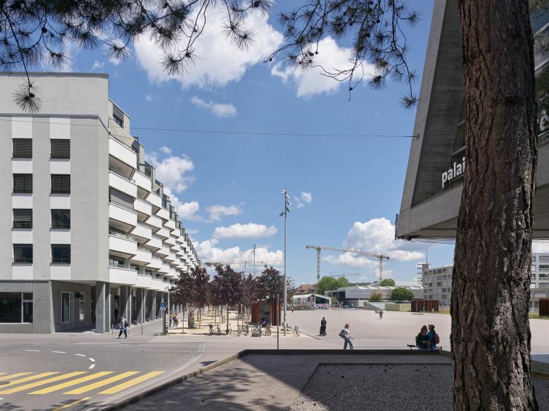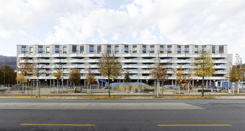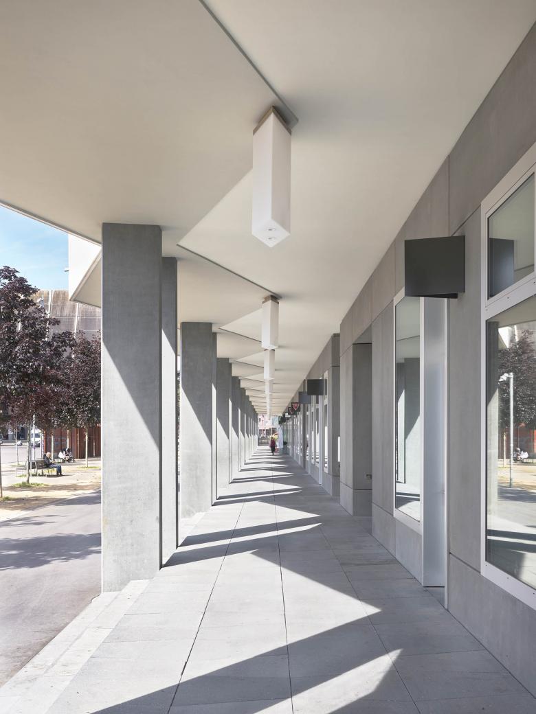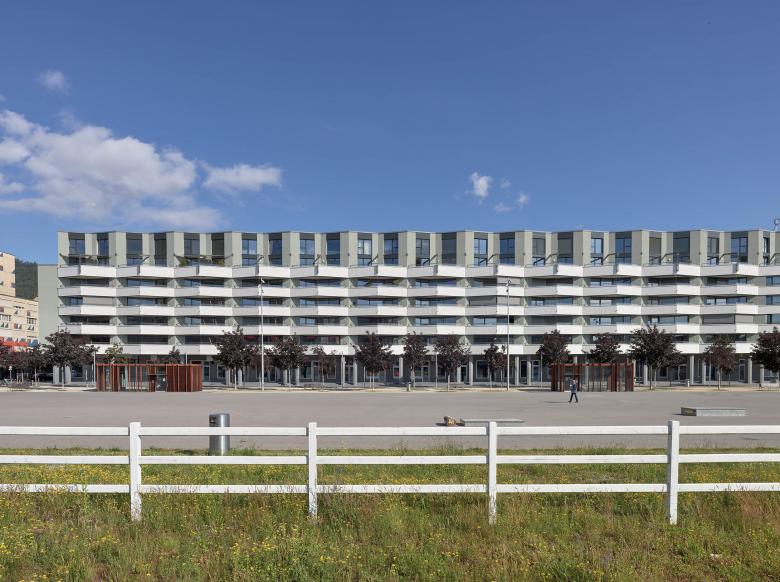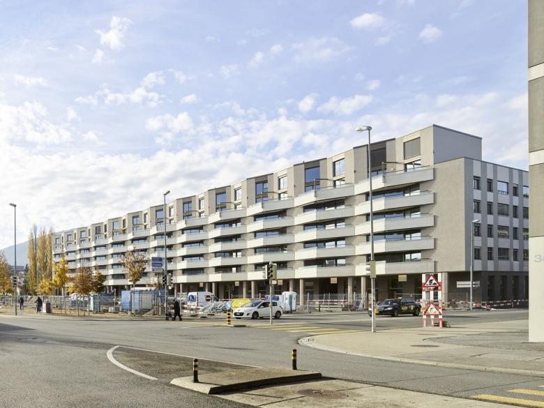 Das Projekt Biel Esplanade Nord auf dem ehemaligen Gaswerkareal in Biel säumt in unmittelbarer Zentrumsnähe einen bedeutenden, städtischen Freiraum / Auftakt zum langgezogenen Platz bildet das prägnante Kongresshaus von Max Schlup aus dem Jahre 1966 / An der nördlichen Längsseite bildet das Projekt eine siebengeschossige, horizontal geschichtete, 300 Meter lange Stadtfront, welche durch gefaltete Balkonloggien eine spezifische Identität entwickelt / Die Arkade im hohen Erdgeschoss sowie die zweigeschossige Ausformulierung des Attikas verleihen der Südfassade eine spannungsvolle Gliederung / Unterschiedlich ausgerichtete und gestaltete Höfe prägen das Projekt im Inneren und ermöglichen eine differenzierte Nutzung der Erdgeschosse / Das Programm umfasst Wohnungen (Teil West und Ost) ein Hotel (Teil West), ein Altersheim (Teil West) und diverse Erdgeschossnutzungen mit Cafés und Läden.