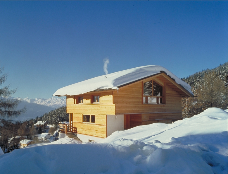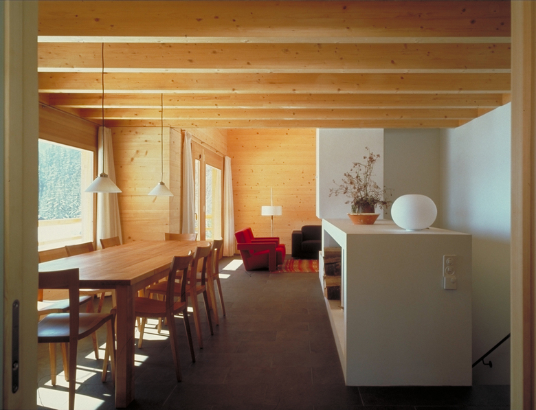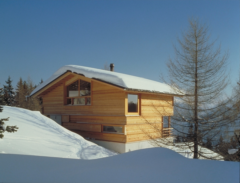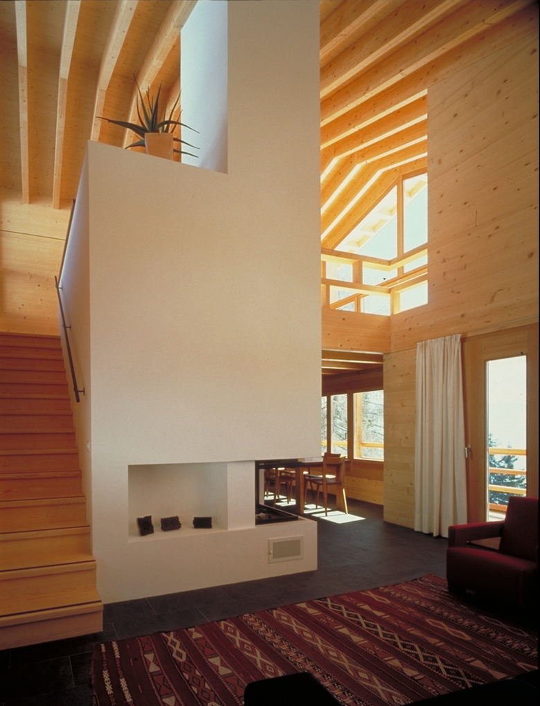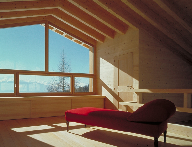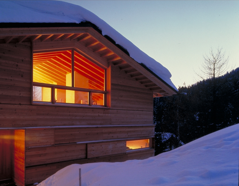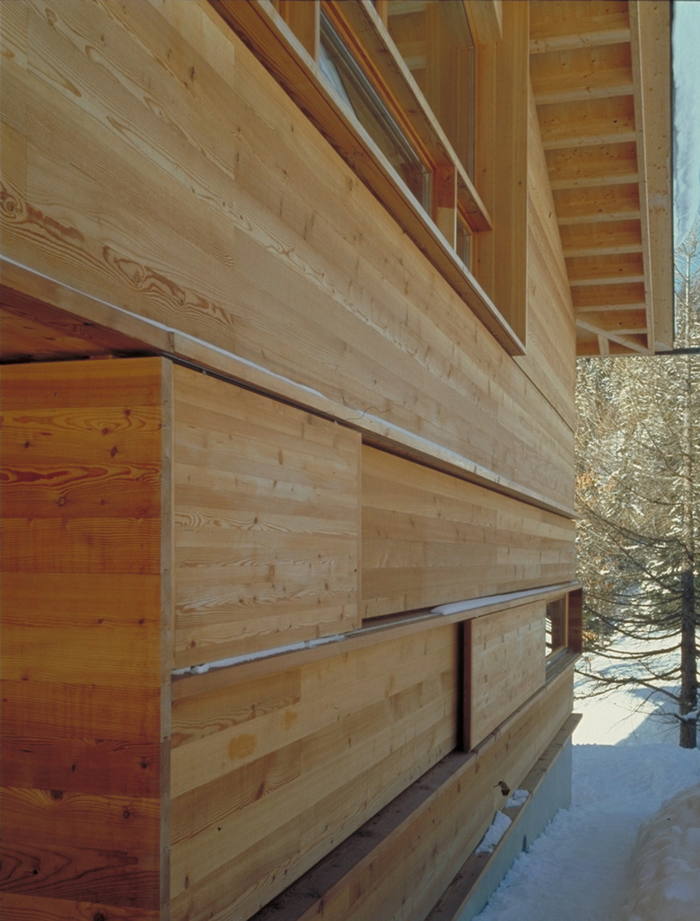 Die Gliederung der Gebäudehülle entwickelt sich aus dem Volumen, bindet Öffnungen wie schiebbare Fensterläden in ein Ordnungsprinzip und verleiht dem Haus eine ruhende „Gesetztheit“ / Im mittleren Geschoss erweitert eine über die ganze Gebäudelänge eingeschnittene Veranda zum Tal hin den Innenraum / Im Dachgeschoss gibt eine über die gesamte Gebäudetiefe aufgespannte Galerie den Blick frei auf die imposante Landschaft / Die rohe Lärchenholzverschalung über einer Tragstruktur aus vorfabrizierten Elementen knüpft an die regionale Holzbautradition an.