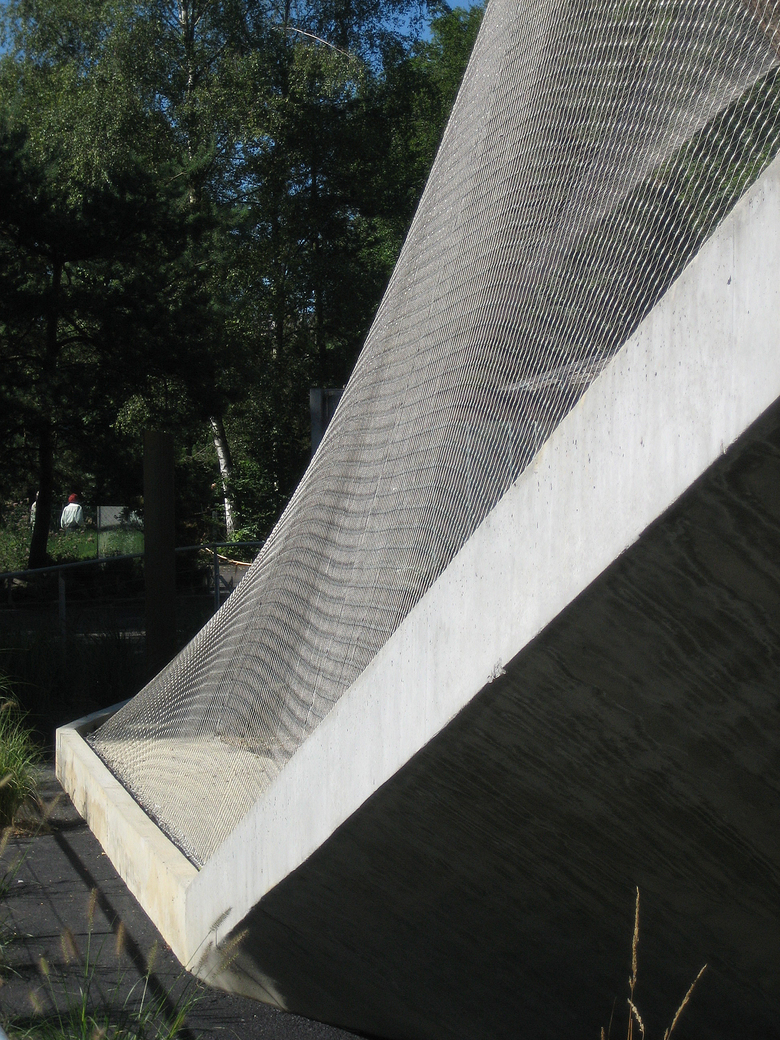 Überdecktes Gehege von rund 600 m2 für Persische Leoparden / Die Struktur des Geheges ist Teil der neu gebildeten Landschaft / Ein das Gehege umfassendes saumartiges Band aus Beton wird im Hintergrund zur Rückwand der künstlichen Landschaft, im Vordergrund zum Dach des verglasten Schaufensters und verankert das textilartige Netz aus Chromstahl am Boden / Das Geflecht wird von fünf, aus dem benachbarten Burgerwald eingeflogenen Eichen getragen und fixiert seinerseits diese Bäume in ihrer Lage / Im variierenden Licht erscheint das Netz wie Nebel über der Landschaft, Spinnweben über Bäumen oder erinnert durch die geschwungene Kontur an die Höhenzüge Persiens.