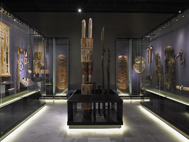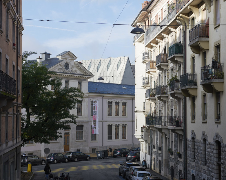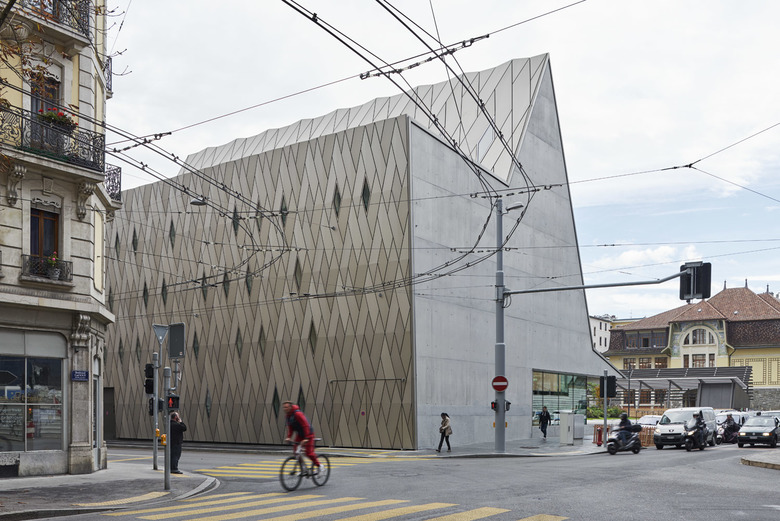 Der oberirdische Teil des neuen Museums hat mit seiner markanten Geometrie eine ikonografische Präsenz im urbanen Kontext / Wie ein Teppich legt sich eine metallene Dachhaut über das aufgeworfene Volumen mit Seitenwänden aus Sichtbeton und evoziert mit seinen rhomboiden Fensteröffnungen Bilder aus der Vergangenheit, als auch Visionen der Zukunft / Der grosszügige Treppenraum verbindet die Mediathek im Dachraum, das Foyer, den Mehrzwecksaal und die Seminarräume mit dem stützenlosen Ausstellungsraum im Untergeschoss / Eingangshalle und Cafeteria im Erdgeschoss sind auf einen vom Strassenniveau leicht erhöhten Platz ausgerichtet