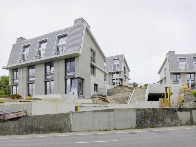 Das Projekt «Südhang» beinhaltet vier elegante Doppelhäuser mit acht Wohneinheiten vor – massgeschneiderte Wohntypen mit räumlichem Mehrwert / Individuelle Zugänge erschliessen grosszügige «Wohnlandschaften» / Die Wohnungen entwickeln sich über mehrere Geschosse, dadurch entstehen Raumkonfigurationen, die von vielseitigen Ausblicken profitieren und Qualitäten freistehender Einfamilienhäuser aufweisen / Geländeterrassierungen zwischen den Bauten schaffen öffentliche wie private Aussenräume und bilden gleichzeitig einen Schutz gegen den Verkehrslärm.