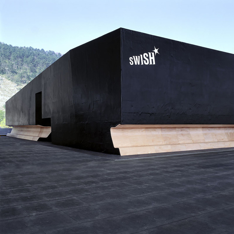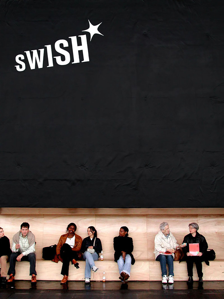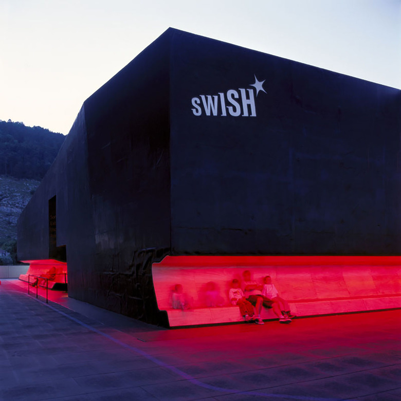 The sWISH* pavillon is first perceived as a mystical black box. Its soft walls enwrap an exhibition on the wishes of the Swiss citizen. The inside accentuates the site it is built upon, the lake of Biel, by opening its exhibition spaces to the platforms underworld. Scenography by Morphing Systems.